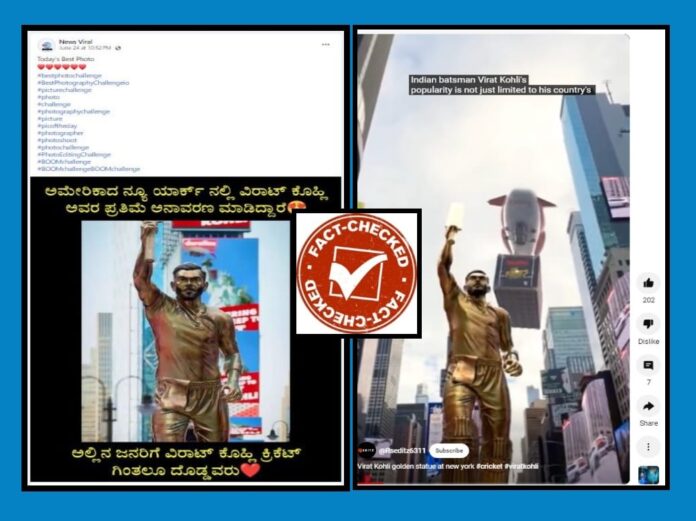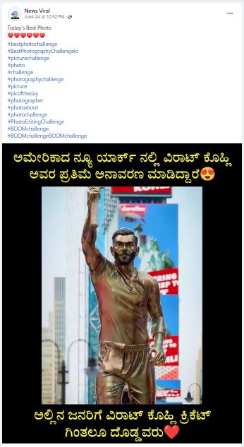 ಅಮೆರಿಕದ ಪ್ರಸಿದ್ಧ ‘ಟೈಮ್ಸ್ ಸ್ಕ್ವೇರ್’ನಲ್ಲಿ ಭಾರತದ ಕ್ರಿಕೆಟ್ ಆಟಗಾರ ವಿರಾಟ್ ಕೊಹ್ಲಿಯ ಪ್ರತಿಮೆ ಅನಾವರಣ ಮಾಡಲಾಗಿದೆ ಎಂಬ ಪೋಸ್ಟ್ವೊಂದು ಸಾಮಾಜಿಕ ಮಾಧ್ಯಮಗಳಲ್ಲಿ ಹರಿದಾಡುತ್ತಿದೆ.