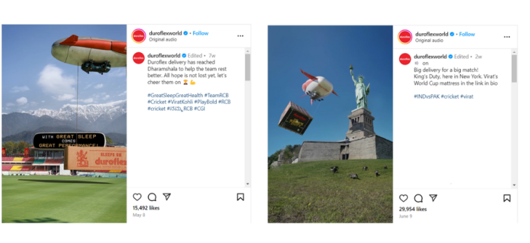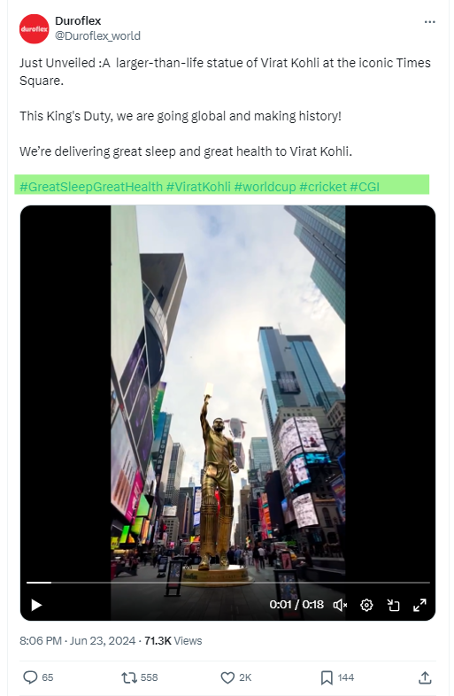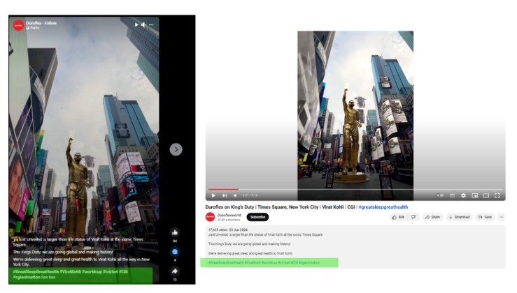 ಗೂಗಲ್ನಲ್ಲಿ “Virat Kohli” “statue” ಮತ್ತು “Duroflex”ಎಂದು ಕೀವರ್ಡ್ ಹುಡುಕಿದಾಗ ಜೂನ್ 23,2024 ರಂದು ಮ್ಯಾಟ್ರೆಸ್ ಸಂಸ್ಥೆಯ ಇನ್ಸ್ಟಾಗ್ರಾಂ ಪೋಸ್ಟ್ ಲಭ್ಯವಾಗಿದೆ. ಅದರಲ್ಲಿ, ವೈರಲ್ ಆದ ವಿಡಿಯೋ ಇದ್ದು, ಆ ವಿಡಿಯೋದಲ್ಲಿ “ಈಗಷ್ಟೇ ಅನಾವರಣಗೊಂಡಿದೆ: ಐಕಾನಿಕ್ ಟೈಮ್ಸ್ ಸ್ಕ್ವೇರ್ನಲ್ಲಿ ವಿರಾಟ್ ಕೊಹ್ಲಿಯ ದೊಡ್ಡ ಪ್ರತಿಮೆ. ಈ ರಾಜನ ಕರ್ತವ್ಯ, ನಾವು ಜಾಗತಿಕವಾಗಿ ವಿಸ್ತರಣೆ ಹೊಂದುತ್ತಿದ್ದು ಇತಿಹಾಸವನ್ನು ನಿರ್ಮಿಸುತ್ತಿದ್ದೇವೆ! ನ್ಯೂಯಾರ್ಕ್, ವೆಸ್ಟ್ ಇಂಡೀಸ್ ಮತ್ತು ವಿಶ್ವಕಪ್ 2024 ರ ಉದ್ದಕ್ಕೂ ವಿರಾಟ್ ಅವರ ನೆಚ್ಚಿನ ಡ್ಯುರೊಫ್ಲೆಕ್ಸ್ ಹಾಸಿಗೆಯನ್ನು ಅವರಿಗೆ ತಲುಪಿಸಲಾಗುತ್ತಿದೆ! #ViratSleepsOnDuroflex *CGIವಿಡಿಯೋ” ಎಂದಿದೆ.