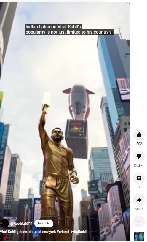 ಟೈಮ್ಸ್ ಸ್ಕ್ವೇರ್ನಲ್ಲಿರುವ ಕೊಹ್ಲಿಯ ಪ್ರತಿಮೆಯನ್ನು ತೋರಿಸುವ ಅದೇ ತುಣುಕನ್ನು ಅವರ X ಖಾತೆಯಲ್ಲಿ “#CGI” ಎಂಬ ಹ್ಯಾಶ್ಟ್ಯಾಗ್ನೊಂದಿಗೆ ಹಂಚಿಕೊಳ್ಳಲಾಗಿದೆ.