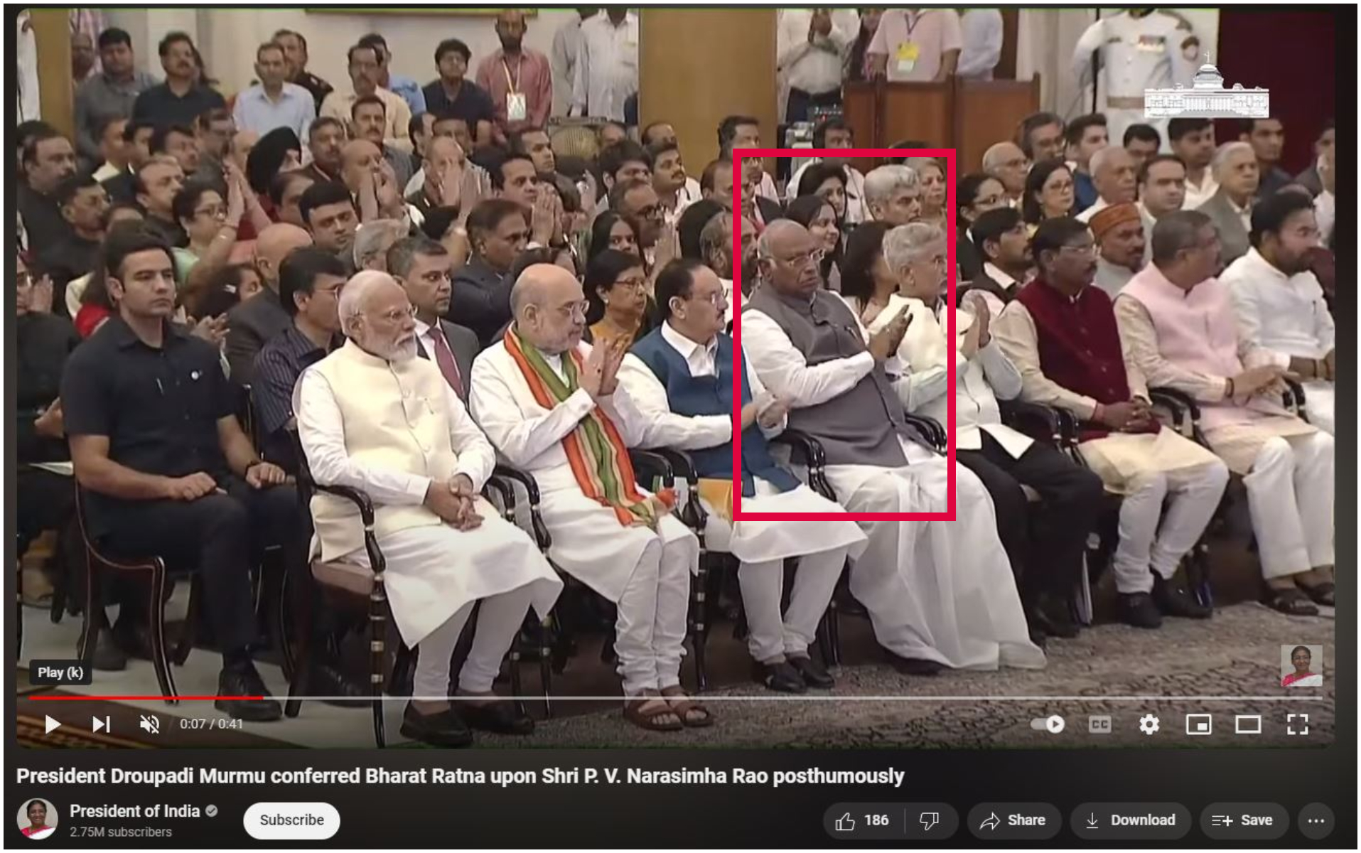 ಪಿ.ವಿ ಪ್ರಭಾಕರ್ ರಾವ್ ಅವರು ತಂದೆಯ ಬದಲಾಗಿ ಪ್ರಶಸ್ತಿ ಸ್ವೀಕರಿಸಿದ ವಿಡಿಯೋವನ್ನು ರಾಷ್ಟ್ರಪತಿಗಳ ಅಧಿಕೃತ ಯೂಟ್ಯೂಬ್ ಖಾತೆಯಲ್ಲಿ ಮಾರ್ಚ್ 31ರಂದು ಅಪ್ಲೋಡ್ ಮಾಡಲಾಗಿದ್ದು, ಅದನ್ನು ಸರಿಯಾಗಿ ಗಮನಿಸಿದಾಗ ನಮಗೆ ಸತ್ಯ ಗೊತ್ತಾಗಿದೆ. ಒಟ್ಟು 41 ಸೆಕೆಂಡ್ನ ವಿಡಿಯೋದಲ್ಲಿ ಮಲ್ಲಿಕಾರ್ಜುನ ಖರ್ಗೆ ಅವರು ಚಪ್ಪಾಳೆ ತಟ್ಟುವ ದೃಶ್ಯವಿದೆ.