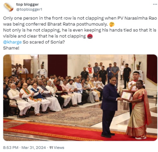 ಪಿ.ವಿ ನರಸಿಂಹರಾವ್ ಅವರ ಪ್ರಶಸ್ತಿಯನ್ನು ನೀಡುವಾಗ ಎಐಸಿಸಿ ಅಧ್ಯಕ್ಷ ಹಾಗೂ ರಾಜ್ಯಸಭೆ ಪ್ರತಿಪಕ್ಷದ ನಾಯಕ ಮಲ್ಲಿಕಾರ್ಜುನ ಖರ್ಗೆ ‘ಚಪ್ಪಾಳೆ ತಟ್ಟಿಲ್ಲ’ ಎಂದು ಪ್ರತಿಪಾದಿಸಲಾದ ಫೋಟೋವೊಂದು ಸಾಮಾಜಿಕ ಜಾಲತಾಣಗಳಲ್ಲಿ ಹರಿದಾಡುತ್ತಿದೆ.