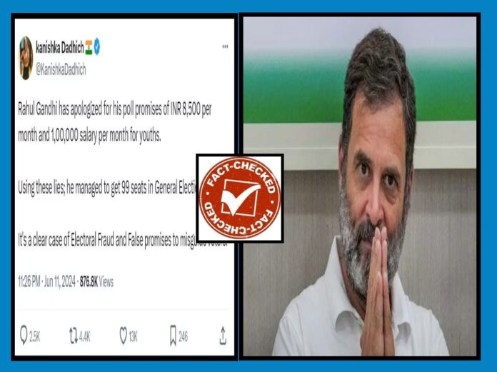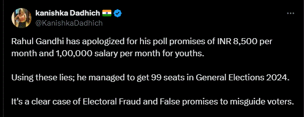 “ಮಾಸಿಕ 8,500 ರೂಪಾಯಿ ಮತ್ತು ವಾರ್ಷಿಕವಾಗಿ 100,000 ರೂ. ಸಹಾಯಧನ ನೀಡುವುದಾಗಿ ಕಾಂಗ್ರೆಸ್ ನಾಯಕ ರಾಹುಲ್ ಗಾಂಧಿ ಲೋಕಸಭೆ ಚುನಾವಣೆಯ ಪೂರ್ವ ಭರವಸೆ ನೀಡಿದ್ದರು. ಈ ವಿಚಾರಕ್ಕೆ ಅವರು ಜನರಲ್ಲಿ ಕ್ಷಮೆ ಯಾಚಿಸಿದ್ದಾರೆ. ಈ ಸುಳ್ಳುಗಳ ಮೂಲಕ ಅವರು (ಕಾಂಗ್ರೆಸ್) ಸಾರ್ವತ್ರಿಕ ಚುನಾವಣೆಯಲ್ಲಿ 99 ಸೀಟ್ ಪಡೆದಿದೆ. ಇದು ಸ್ಪಷ್ಟವಾಗಿ ಜನರನ್ನು ದಾರಿತಪ್ಪಿಸುವ ಮೂಲಕ ನಡೆಸಿದ ಚುನಾವಣಾ ವಂಚನೆಯಾಗಿದೆ” ಎಂದು ಸಾಮಾಜಿಕ ಮಾಧ್ಯಮಗಳಲ್ಲಿ ಹಲವರು ಪೋಸ್ಟ್ ಹಾಕಿಕೊಂಡಿದ್ದಾರೆ.