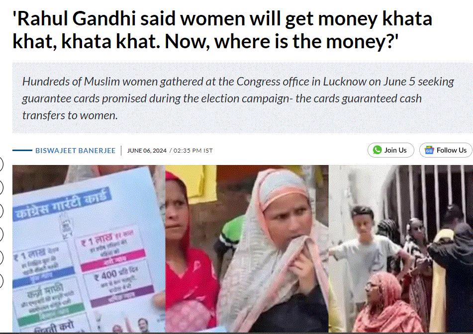 ಚುನಾವಣೆಯ ಫಲಿತಾಂಶದ ಬಳಿಕ ಲಕ್ನೋದ ಕಾಂಗ್ರೆಸ್ ಕಚೇರಿ ಮುಂದೆ ಗ್ಯಾರಂಟಿ ಕಾರ್ಡ್ ಹಿಡಿದು ಕೆಲ ಮಹಿಳೆಯರು ಗುಂಪು ಸೇರಿದ್ದರು. ಮಾಧ್ಯಮದವರು ಕೇಳಿದ್ದಕ್ಕೆ ಕಾಂಗ್ರೆಸ್ ಚುನಾವಣಾ ಪೂರ್ವ ಭರವಸೆ ನೀಡಿದ್ದ ಗ್ಯಾರಂಟಿ ಹಣಕ್ಕಾಗಿ ಆಗಮಿಸಿದ್ದೇವೆ ಎಂದಿದ್ದರು.