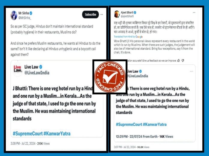 ಸದಾ ಕೋಮುದ್ವೇಷದ ಸುದ್ದಿಗಳನ್ನು ಹಂಚಿಕೊಳ್ಳುವ ಮಿ.ಸಿನ್ಹಾ (@MrSinha_) ಎಂಬ ಎಕ್ಸ್ ಬಳಕೆದಾರ ಲೈವ್ ಲಾ ಸುದ್ದಿಯ ಸ್ಕ್ರೀನ್ ಶಾಟ್ ಹಂಚಿಕೊಂಡು “ಹಾಗಾದರೆ ಸುಪ್ರೀಂ ಕೋರ್ಟ್ ನ್ಯಾಯಾಧೀಶರ ಪ್ರಕಾರ, ಹಿಂದೂಗಳು ತಮ್ಮ ರೆಸ್ಟೋರೆಂಟ್ಗಳಲ್ಲಿ ಅಂತಾರಾಷ್ಟ್ರೀಯ ಗುಣಮಟ್ಟವನ್ನು (ಬಹುಶಃ ನೈರ್ಮಲ್ಯ) ಕಾಪಾಡುತ್ತಿಲ್ಲ.. ಮುಸ್ಲಿಮರು ಕಾಪಾಡುತ್ತಿದ್ದಾರಾ?”