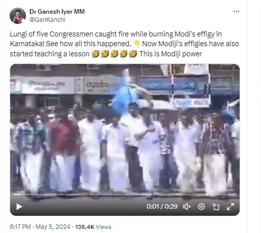 ಕರ್ನಾಟಕದಲ್ಲಿ ಪ್ರತಿಭಟನೆ ವೇಳೆ ಪ್ರಧಾನಿ ನರೇಂದ್ರ ಮೋದಿಯವರ ಪ್ರತಿಕೃತಿ ದಹಿಸಲು ಹೋದ ಕಾಂಗ್ರೆಸ್ಸಿಗರ ಪಂಚೆಗೆ ಬೆಂಕಿ ತಗುಲಿದೆ ಎಂದು ವಿಡಿಯೋವೊಂದನ್ನು ಸಾಮಾಜಿಕ ಜಾಲತಾಣಗಳಲ್ಲಿ ಹಂಚಿಕೊಳ್ಳಲಾಗಿದೆ.