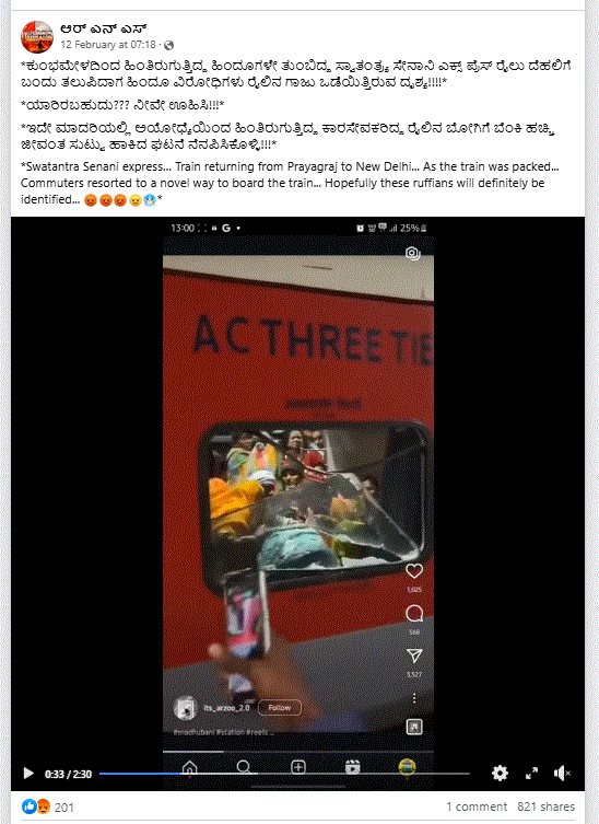 ಫೆಬ್ರವರಿ 12ರಂದು ಆರ್ಎನ್ಎಸ್ ಎಂಬ ಫೇಸ್ಬುಕ್ ಖಾತೆಯಲ್ಲಿ ರೈಲಿನ ಕಿಟಕಿ ಗಾಜನ್ನು ಯುವಕರ ಗುಂಪು ಒಡೆದು ಹಾಕುತ್ತಿರುವ ವಿಡಿಯೋ ಹಂಚಿಕೊಂಡು “ಕುಂಭಮೇಳದಿಂದ ಹಿಂದಿರುಗುತ್ತಿದ್ದ ಹಿಂದೂಗಳೇ ತುಂಬಿದ್ದ ಸ್ವಾಂತಂತ್ರ್ಯ ಸೇನಾನಿ ಎಕ್ಸ್ಪ್ರೆಸ್ ರೈಲು ದೆಹಲಿಗೆ ಬಂದು ತಲುಪಿದಾಗ ಹಿಂದೂ ವಿರೋಧಿಗಳು ರೈಲಿನ ಗಾಜು ಒಡೆಯುತ್ತಿರುವ ದೃಶ್ಯ. ಯಾರಿರಬಹುದು ನೀವೆ ಊಹಿಸಿ. ಇದೇ ಮಾದರಿಯಲ್ಲಿ ಅಯೋಧ್ಯೆಯಿಂದ ಹಿಂದಿರುಗುತ್ತಿದ್ದ ಕರಸೇವಕರಿದ್ದ ರೈಲಿನ ಬೋಗಿಗೆ ಬೆಂಕಿ ಹಂಚಿ ಜೀವಂತ ಸುಟ್ಟು ಹಾಕಿದ ಘಟನೆ ನೆನಪಿಸಿಕೊಳ್ಳಿ” ಎಂದು ಬರೆಯಲಾಗಿತ್ತು.