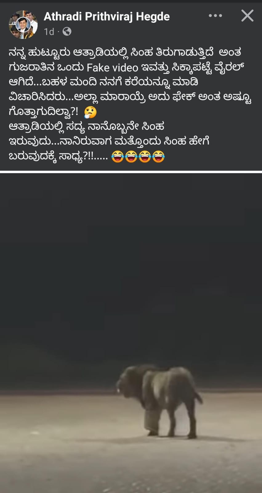 ಅತ್ರಾಡಿ ಪೃಥ್ವಿರಾಜ್ ಹೆಗ್ಡೆ ಎಂಬವರು ಸೆಪ್ಟೆಂಬರ್ 10ರಂದು ಫೇಸ್ಬುಕ್ನಲ್ಲಿ ವಿಡಿಯೋ ಹಂಚಿಕೊಂಡು ” ನನ್ನ ಹುಟ್ಟೂರು ಆತ್ರಾಡಿಯಲ್ಲಿ ಸಿಂಹ ತಿರುಗಾಡುತ್ತಿದೆ ಅಂತ ಗುಜರಾತಿನ ಒಂದು Fake video ಇವತ್ತು ಸಿಕ್ಕಾಪಟ್ಟೆ ವೈರಲ್ ಆಗಿದೆ…ಬಹಳ ಮಂದಿ ನನಗೆ ಕರೆಯನ್ನೂ ಮಾಡಿ ವಿಚಾರಿಸಿದರು…ಅಲ್ಲಾ ಮಾರಾಯ್ರೆ ಅದು ಫೇಕ್ ಅಂತ ಅಷ್ಟೂ ಗೊತ್ತಾಗುದಿಲ್ವಾ?! ಆತ್ರಾಡಿಯಲ್ಲಿ ಸದ್ಯ ನಾನೊಬ್ಬನೇ ಸಿಂಹ ಇರುವುದು…ನಾನಿರುವಾಗ ಮತ್ತೊಂದು ಸಿಂಹ ಹೇಗೆ ಬರುವುದಕ್ಕೆ ಸಾಧ್ಯ?!!” ಎಂದು ಬರೆದುಕೊಂಡಿದ್ದರು. ಈ ಅತ್ರಾಡಿ ಉಡುಪಿ ಜಿಲ್ಲೆಯಲ್ಲಿದೆ.