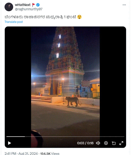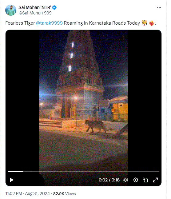 Sai Mohan ‘NTR'(@Sai_Mohan_999) ಎಂಬ ಮತ್ತೊಬ್ಬರು ಎಕ್ಸ್ ಬಳಕೆದಾರರು ಆಗಸ್ಟ್ 31ರಂದು ಅದೇ ವಿಡಿಯೋವನ್ನು ಹಂಚಿಕೊಂಡು “ಇಂದು ಕರ್ನಾಟಕದ ರಸ್ತೆಯಲ್ಲಿ ಭಯವಿಲ್ಲದೆ ಓಡಾಡಿದ ಸಿಂಹ” ಎಂದು ಬರೆದುಕೊಂಡಿದ್ದಾರೆ.