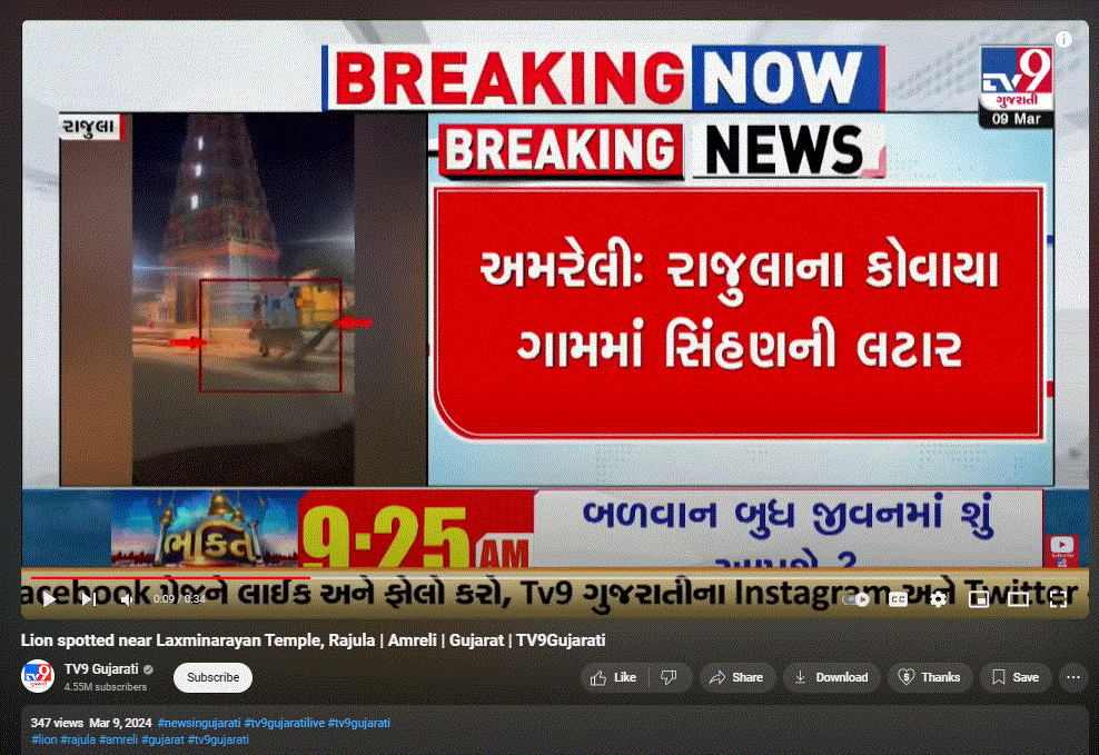 ಟಿವಿ9 ಗುಜರಾತ್ ಮಾರ್ಚ್ 9, 2024ರಂದು ತನ್ನ ಯೂಟ್ಯೂಬ್ ಚಾನೆಲ್ನಲ್ಲಿ ವೈರಲ್ ವಿಡಿಯೋ ಕುರಿತು ಸುದ್ದಿ ಪ್ರಕಟಿಸಿತ್ತು. ಅದರಲ್ಲಿ ಅಮ್ರೇಲಿಯ ರಾಜೌಲಾದ ಲಕ್ಷ್ಮೀ ನಾರಾಯಣ ದೇವಸ್ಥಾನದ ಬಳಿ ಸಿಂಹ ಕಾಣಿಸಿಕೊಂಡಿದೆ ಎಂದು ಹೇಳಿತ್ತು.