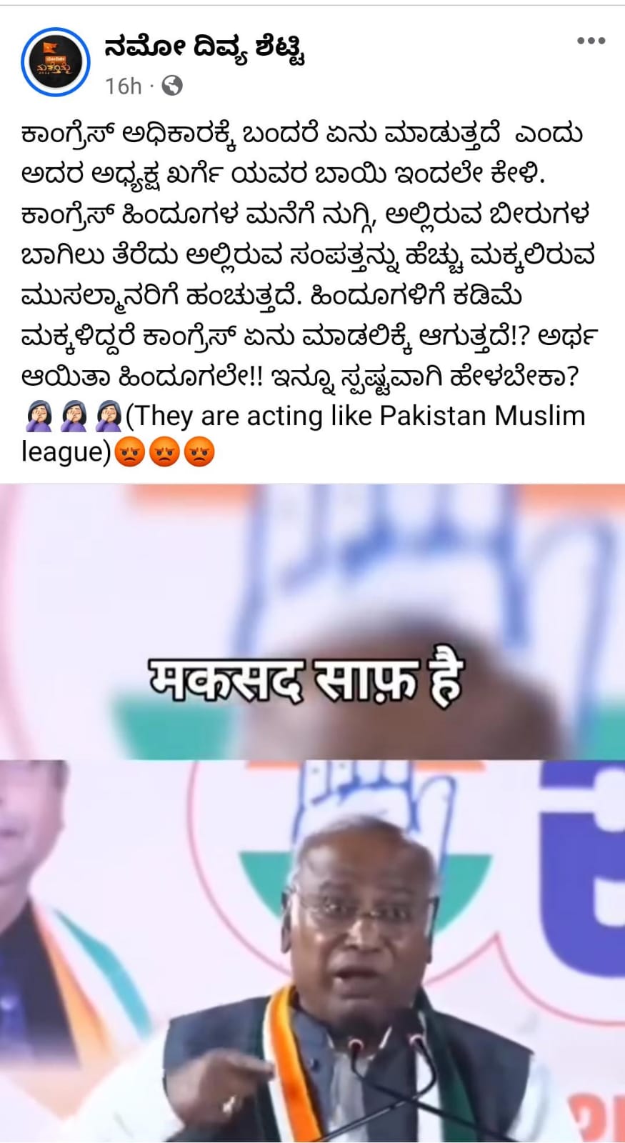 “ಕಾಂಗ್ರೆಸ್ ಅಧಿಕಾರಕ್ಕೆ ಬಂದರೆ ಏನು ಮಾಡುತ್ತದೆ ಎಂದು ಅದರ ಅಧ್ಯಕ್ಷ ಖರ್ಗೆ ಯವರ ಬಾಯಿ ಇಂದಲೇ ಕೇಳಿ. ಕಾಂಗ್ರೆಸ್ ಹಿಂದೂಗಳ ಮನೆಗೆ ನುಗ್ಗಿ, ಅಲ್ಲಿರುವ ಬೀರುಗಳ ಬಾಗಿಲು ತೆರೆದು, ಅಲ್ಲಿರುವ ಹಣವನ್ನೆಲ್ಲ ದೋಚಿ ಹೆಚ್ಚು ಮಕ್ಕಳಿರುವ ಮುಸಲ್ಮಾನರಿಗೆ ಹಂಚಲಿದೆ. ಹಿಂದೂಗಳಿಗೆ ಕಡಿಮೆ ಮಕ್ಕಳಿದ್ದರೆ ಕಾಂಗ್ರೆಸ್ ಏನು ಮಾಡಲಿಕ್ಕೆ ಆಗುತ್ತದೆ!? ಅರ್ಥ ಆಯಿತಾ ಹಿಂದೂಗಲೇ!! ಇನ್ನೂ ಸ್ಪಷ್ಟವಾಗಿ ಹೇಳಬೇಕಾ?” ಎಂದು ಬರೆದು ಎಐಸಿಸಿ ಅಧ್ಯಕ್ಷ ಮಲ್ಲಿಕಾರ್ಜುನ ಖರ್ಗೆಯವರ ವಿಡಿಯೋವೊಂದನ್ನು ಫೇಸ್ಬುಕ್ನಲ್ಲಿ ಹಂಚಿಕೊಳ್ಳಲಾಗಿದೆ.