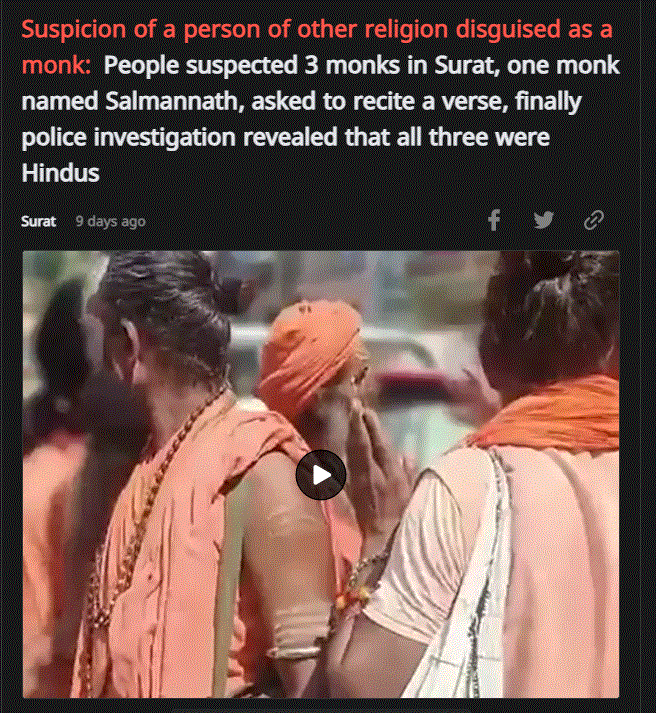 ಮತ್ತೊಂದು ಬಲಪಂಥೀಯ ಸುದ್ದಿ ಸಂಸ್ಥೆ ಸುದರ್ಶನ್ ನ್ಯೂಸ್ ಕೂಡ ನವೆಂಬರ್ 4ರಂದು ವೈರಲ್ ವಿಡಿಯೋ ಹಂಚಿಕೊಂಡು “ಗುಜರಾತ್ನ ಸೂರತ್ನಲ್ಲಿ, ‘ಜಿಹಾದಿ’ ಸಲ್ಮಾನ್ ಮತ್ತು ಆತನ ಗ್ಯಾಂಗ್ ಸಾಧುಗಳಂತೆ ಪೋಸು ಕೊಡುತ್ತಾ ಭಿಕ್ಷೆ ಬೇಡುತ್ತಿದ್ದರು… ಕೇಸರಿ ವಸ್ತ್ರಗಳನ್ನು ಧರಿಸಿ ಸಾಧುಗಳಂತೆ ಪೋಸು ಕೊಡುತ್ತಿದ್ದ ಮೂವರು ‘ಜಿಹಾದಿ’ಗಳನ್ನು ಬಂಧಿಸಲಾಗಿದೆ” ಎಂದು ಬರೆದುಕೊಂಡಿತ್ತು.