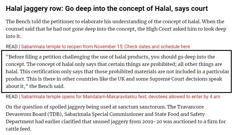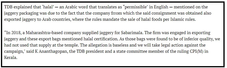 ಹಲಾಲ್ನ ಪ್ರಶ್ನೆಗೆ, ‘ಬೆಲ್ಲದ ಪ್ಯಾಕೇಜಿಂಗ್ನಲ್ಲಿ ಇಂಗ್ಲಿಷ್ನಲ್ಲಿ “permissible” ಎಂದು ಅನುವಾದಿಸುವ ಅರೇಬಿಕ್ ಪದವಾದ ಹಲಾಲ್ ಎಂಬ ಪದವನ್ನು ಉಲ್ಲೇಖಿಸಲಾಗಿದೆ ಎಂದು TDB ವಿವರಿಸಿದೆ. ಈ ಸರಕುಗಳನ್ನು ಪಡೆದ ಕಂಪನಿಯು ಅರಬ್ ದೇಶಗಳಿಗೆ ಬೆಲ್ಲವನ್ನು ರಫ್ತು ಮಾಡಿದೆ. ಅಲ್ಲಿನ ನಿಯಮಗಳು ಇಸ್ಲಾಮಿಕ್ ನಿಯಮಗಳನ್ನು ಅನುಸರಿಸುವುದರಿಂದಾಗಿ, ಹಲಾಲ್ ಆಹಾರಗಳ ಮಾರಾಟವನ್ನು ಕಡ್ಡಾಯಗೊಳಿಸುತ್ತವೆ ಎಂದು ನ್ಯೂಸ್ 18 ವರದಿ ಮಾಡಿದೆ.