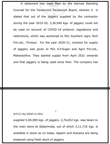 ಅಂದರೆ ಕಲ್ಪಿತ ಆರೋಪವನ್ನು ಮಾಡಲಾಗಿದೆ. ಈ ಬಗ್ಗೆ ತಿರುವಾಂಕೂರು ದೇವಸ್ವಂ ಮಂಡಳಿ ಪ್ರತಿಕ್ರಿಯೆ ಸಲ್ಲಿಸಿದೆ. ಅವರ ಪ್ರತಿಕ್ರಿಯೆಯಲ್ಲಿ, ಕೋವಿಡ್-19 ಪ್ರೋಟೋಕಾಲ್ನಿಂದಾಗಿ 2019-20ನೇ ವರ್ಷಕ್ಕೆ ಹೆಚ್ಚಿನ ಪ್ರಮಾಣದ ಬೆಲ್ಲವು ಬಳಸದೆ ಉಳಿದಿದೆ. ಆದ್ದರಿಂದ ಮಂಡಳಿಯು ಈ ಉಳಿದ ಬೆಲ್ಲವನ್ನು M/s ಸದರ್ನ್ ಆಗ್ರೋ ಟೆಕ್ ಪ್ರೈವೇಟ್ ಲಿಮಿಟೆಡ್, ತ್ರಿಶೂರ್ಗೆ ನೀಡಿದೆ ಎಂದು ಮಂಡಳಿಯು ಹೇಳಿದೆ. ಆದರೆ 2020-21ನೇ ಸಾಲಿಗೆ ಬೆಲ್ಲ ಪೂರೈಕೆಯ ಗುತ್ತಿಗೆಯನ್ನು M/s S.P.Sugar and Agro Pvt. lmt, ಮಹಾರಾಷ್ಟ್ರಕ್ಕೆ ನೀಡಲಾಗಿದ್ದು, ಅವರು ಏಪ್ರಿಲ್ 2021 ರಿಂದ ಪೂರೈಕೆಯನ್ನು ಪ್ರಾರಂಭಿಸಿದ್ದಾರೆ. ಅಂದಿನಿಂದ ಆ ಬೆಲ್ಲವನ್ನು ಬಳಸಲಾಗುತ್ತಿದೆ.