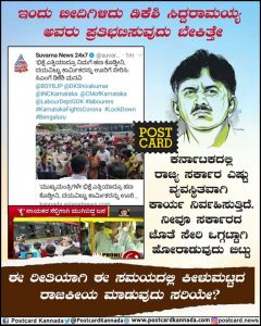 ಇಂದು ಸಿದ್ದರಾಮಯ್ಯ ಮತ್ತು ಡಿ.ಕೆ ಶಿವಕುಮಾರ್ರವರು ಬೀದಿಗಿಳಿದು ಪ್ರತಿಭಟನೆ ನಡೆಸುವುದು ಬೇಕಿತ್ತೇ? ಕರ್ನಾಟಕದಲ್ಲಿ ರಾಜ್ಯ ಸರ್ಕಾರ ಎಷ್ಟು ವ್ಯವಸ್ಥಿತವಾಗಿ ಕೆಲಸ ಮಾಡುತ್ತಿದೆ. ನೀವೂ ಸರ್ಕಾರದ ಜೊತೆ ಸೇರಿ ಒಗ್ಗಟ್ಟಾಗಿ ಹೋರಾಡುವುದು ಬಿಟ್ಟು ಈ ರೀತಿಯಾಗಿ, ಈ ಸಮಯದಲ್ಲಿ ಕೀಳುಮಟ್ಟದ ರಾಜಕೀಯ ಮಾಡುವುದು ಸರಿಯೇ? ಎಂದು ಪೋಸ್ಟ್ ಕಾರ್ಡ್ ಪೋಸ್ಟ್ ಮಾಡಿ ಹರಡಿದೆ.