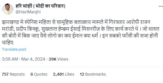 ಬಂಧಿತ ವ್ಯಕ್ತಿಗಳು ಕ್ರಿಶ್ಚಿಯನ್ ಮಿಷನರಿಗಾಗಿ ಕೆಲಸ ಮಾಡುತ್ತಿದ್ದರು ಎಂದು ಬಿಜೆಪಿ ನಾಯಕ ಮತ್ತು ಬೋಧಗಯಾದ ಮಾಜಿ ಶಾಸಕ ಹರಿ ಮಾಂಝಿ ತಮ್ಮ ಎಕ್ಸ್ ಖಾತೆಯಲ್ಲಿ ಪೋಸ್ಟ್ ಮಾಡಿದ್ದರು. “ರೈಸ್ ಬ್ಯಾಗ್ಗಾಗಿ ಮಾರಲ್ಪಡುವ ಈ ಜನರು ಯಾವ ನಂಬಿಕೆ ಅಥವಾ ಧರ್ಮಕ್ಕೆ ಸೇರಿದವರು? ಇವರೆಲ್ಲರಿಗೂ ಮರಣದಂಡನೆ ವಿಧಿಸಬೇಕು” ಎಂದು ಅವರು ಬರೆದುಕೊಂಡಿದ್ದರು.