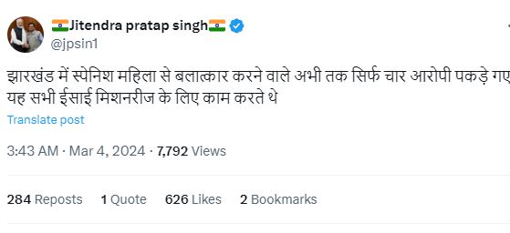ಪ್ರಧಾನಿ ನರೇಂದ್ರ ಮೋದಿ ಫಾಲೋ ಮಾಡುತ್ತಿರುವ ಬಲಪಂಥೀಯ ಸಾಮಾಜಿಕ ಜಾಲತಾಣ ಪ್ರಭಾವಿ ಜಿತೇಂದ್ರ ಪ್ರತಾಪ್ ಸಿಂಗ್, “ಬಂಧಿತರೆಲ್ಲರೂ ಕ್ರಿಶ್ಚಿಯನ್ ಮಿಷನರಿಗಳಿಗಾಗಿ ಕೆಲಸ ಮಾಡಿದವರು” ಎಂದು ಬರೆದುಕೊಂಡಿದ್ದರು.