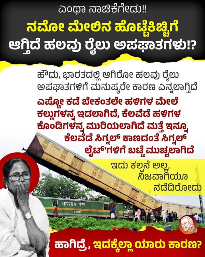 “ಎಂಥಾ ನಾಚಿಕೆಗೇಡು!! ನಮೋ ಮೇಲಿನ ಹೊಟ್ಟೆಕಿಚ್ಚಿಗೆ ಆಗ್ತಿದೆ ಹಲವು ರೈಲು ಅಪಘಾತಗಳು!? ಹೌದು, ಭಾರತದಲ್ಲಿ ಆಗಿರೋ ಹಲವು ರೈಲು ಅಪಘಾತಗಳಿಗೆ ಮನುಷ್ಯರೇ ಕಾರಣ ಎನ್ನಲಾಗ್ತಿದೆ. ಎಷ್ಟೋ ಕಡೆ ಬೇಕಂತಲೇ ಹಳಿಗಳ ಮೇಲೆ ಕಲ್ಲುಗಳನ್ನು ಇಡಲಾಗಿದೆ. ಕೆಲವೆಡೆ ಹಳಿಗಳ ಕೊಂಡಿಗಳನ್ನು ಮುರಿಯಲಾಗಿದೆ. ಇನ್ನೂ ಕೆಲವೆಡೆ ಸಿಗ್ನಲ್ ಕಾಣದಂತೆ ಲೈಟ್ಗಳಿಗೆ ಬಟ್ಟೆ ಮುಚ್ಚಲಾಗಿದೆ. ಇದು ಕಲ್ಪನೆ ಅಲ್ಲ, ನಿಜವಾಗಿಯೂ ನಡೆದಿರೋದು. ಹಾಗಿದ್ರೆ ಇದಕ್ಕೆಲ್ಲಾ ಯಾರು ಕಾರಣ?” ಎಂದು ಪೋಸ್ಟರ್ನಲ್ಲಿ ಬರೆಯಲಾಗಿದೆ.