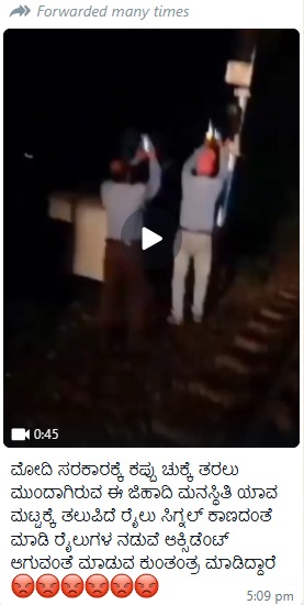 ಇತ್ತೀಚೆಗೆ, ಕೆಲ ವ್ಯಕ್ತಿಗಳು ರೈಲ್ವೆಯ ಸಿಗ್ನಲ್ ಲೈಟ್ಗೆ ಬಟ್ಟೆ ಕಟ್ಟುವ ವಿಡಿಯೋ ಸಾಮಾಜಿಕ ಜಾಲತಾಣಗಳಲ್ಲಿ ವೈರಲ್ ಆಗಿತ್ತು. ಅದರ ಸ್ಕ್ರೀನ್ ಹಂಚಿಕೊಂಡಿರುವ ಕೆಲವರು, “ಮೋದಿ ಸರ್ಕಾರಕ್ಕೆ ಕಪ್ಪು ಚುಕ್ಕೆ ತರಲು ಮುಂದಾಗಿರುವ ಈ ಜಿಹಾದಿ ಮನಸ್ಥಿತಿ ಯಾವ ಮಟ್ಟಕ್ಕೆ ತಲುಪಿದೆ ಎಂದರೆ, ರೈಲು ಸಿಗ್ನಲ್ ಕಾಣದಂತೆ ಮಾಡಿ ರೈಲುಗಳ ನಡುವೆ ಆಕ್ಸಿಂಡೆಂಟ್ ಆಗುವಂತೆ ಮಾಡುವ ಕುತಂತ್ರ ಮಾಡಿದ್ದಾರೆ” ಎಂದು ಬರೆಯಲಾಗಿದೆ.