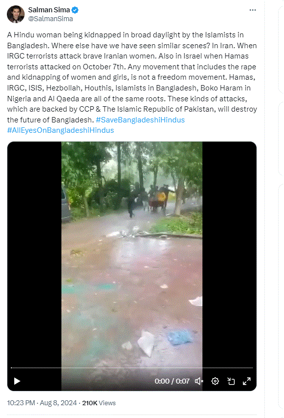 ಸಲ್ಮಾನ್ ಸೀಮಾ ಎಂಬ ಎಕ್ಸ್ ಬಳಕೆದಾರರು ಆಗಸ್ಟ್ 8, 2024ರಂದು ವಿಡಿಯೋ ಹಂಚಿಕೊಂಡಿದ್ದು, “ಬಾಂಗ್ಲಾದೇಶದಲ್ಲಿ ಹಿಂದೂ ಮಹಿಳೆಯನ್ನು ಹಾಡಹಗಲೇ ಇಸ್ಲಾಮಿಸ್ಟ್ಗಳು ಅಪಹರಿಸಿದ್ದಾರೆ. ಇದೇ ರೀತಿಯ ದೃಶ್ಯಗಳನ್ನು ನಾವು ಬೇರೆಲ್ಲಿ ನೋಡಿದ್ದೇವೆ?. IRGC ಭಯೋತ್ಪಾದಕರು ಕೆಚ್ಚೆದೆಯ ಇರಾನಿನ ಮಹಿಳೆಯರ ಮೇಲೆ ದಾಳಿ ಮಾಡಿದಾಗ ಈ ರೀತಿಯ ಘಟನೆ ಕಂಡಿದ್ದೇವೆ. ಹಮಾಸ್, ಐಆರ್ಜಿಸಿ, ಐಸಿಸ್, ಹಿಜ್ಬುಲ್ಲಾ, ಹೌತಿಗಳು, ಬಾಂಗ್ಲಾದೇಶದ ಇಸ್ಲಾಮಿಸ್ಟ್ಗಳು, ನೈಜೀರಿಯಾದ ಬೊಕೊ ಹರಾಮ್ ಮತ್ತು ಅಲ್ ಖೈದಾ ಇವೆಲ್ಲವೂ ಒಂದೇ ಬೇರುಗಳು. ಸಿಸಿಪಿ ಮತ್ತು ಇಸ್ಲಾಮಿಕ್ ರಿಪಬ್ಲಿಕ್ ಪಾಕಿಸ್ತಾನದಿಂದ ಬೆಂಬಲಿತವಾಗಿರುವ ಈ ರೀತಿಯ ದಾಳಿಗಳು ಬಾಂಗ್ಲಾದೇಶದ ಭವಿಷ್ಯವನ್ನು ನಾಶಮಾಡುತ್ತವೆ. ಬಾಂಗ್ಲಾದೇಶಿ ಹಿಂದೂಗಳನ್ನು ಉಳಿಸಿ” ಎಂದು ಬರೆದುಕೊಂಡಿದ್ದಾರೆ.