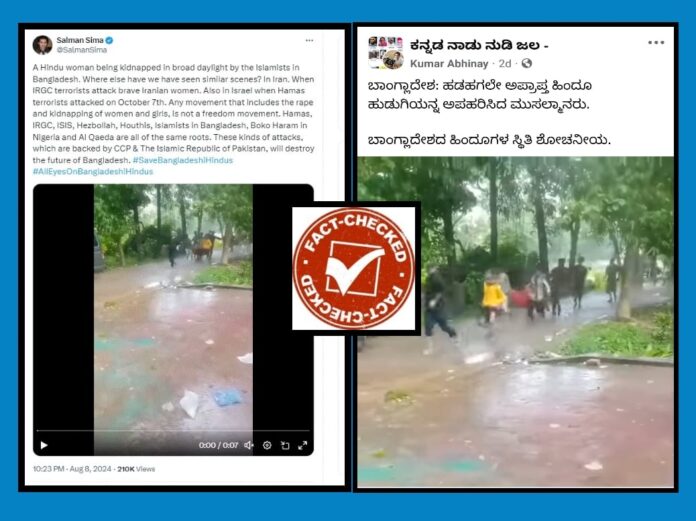 ಸಲ್ಮಾನ್ ಸೀಮಾ ಎಂಬ ಎಕ್ಸ್ ಬಳಕೆದಾರರು ಆಗಸ್ಟ್ 8, 2024ರಂದು ವಿಡಿಯೋ ಹಂಚಿಕೊಂಡಿದ್ದು, “ಬಾಂಗ್ಲಾದೇಶದಲ್ಲಿ ಹಿಂದೂ ಮಹಿಳೆಯನ್ನು ಹಾಡಹಗಲೇ ಇಸ್ಲಾಮಿಸ್ಟ್ಗಳು ಅಪಹರಿಸಿದ್ದಾರೆ. ಇದೇ ರೀತಿಯ ದೃಶ್ಯಗಳನ್ನು ನಾವು ಬೇರೆಲ್ಲಿ ನೋಡಿದ್ದೇವೆ?. IRGC ಭಯೋತ್ಪಾದಕರು ಕೆಚ್ಚೆದೆಯ ಇರಾನಿನ ಮಹಿಳೆಯರ ಮೇಲೆ ದಾಳಿ ಮಾಡಿದಾಗ ಈ ರೀತಿಯ ಘಟನೆ ಕಂಡಿದ್ದೇವೆ. ಹಮಾಸ್, ಐಆರ್ಜಿಸಿ, ಐಸಿಸ್, ಹಿಜ್ಬುಲ್ಲಾ, ಹೌತಿಗಳು, ಬಾಂಗ್ಲಾದೇಶದ ಇಸ್ಲಾಮಿಸ್ಟ್ಗಳು, ನೈಜೀರಿಯಾದ ಬೊಕೊ ಹರಾಮ್ ಮತ್ತು ಅಲ್ ಖೈದಾ ಇವೆಲ್ಲವೂ ಒಂದೇ ಬೇರುಗಳು. ಸಿಸಿಪಿ ಮತ್ತು ಇಸ್ಲಾಮಿಕ್ ರಿಪಬ್ಲಿಕ್ ಪಾಕಿಸ್ತಾನದಿಂದ ಬೆಂಬಲಿತವಾಗಿರುವ ಈ ರೀತಿಯ ದಾಳಿಗಳು ಬಾಂಗ್ಲಾದೇಶದ ಭವಿಷ್ಯವನ್ನು ನಾಶಮಾಡುತ್ತವೆ. ಬಾಂಗ್ಲಾದೇಶಿ ಹಿಂದೂಗಳನ್ನು ಉಳಿಸಿ” ಎಂದು ಬರೆದುಕೊಂಡಿದ್ದಾರೆ.