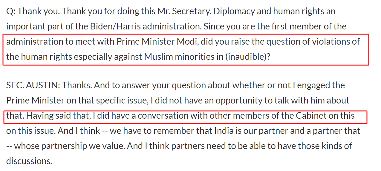 ಲಾಯ್ಡ್ ಜೆ ಆಸ್ಟಿನ್ ಭಾಗವಹಿಸಿದ ನಡೆದ ಸಮ್ಮೇಳನದ ಸಂಪೂರ್ಣ ಪ್ರತಿಲೇಖನವನ್ನು ಯುಎಸ್ ರಕ್ಷಣಾ ಇಲಾಖೆ ಅಪ್‌ಲೋಡ್ ಮಾಡಿದೆ. ಪ್ರಧಾನಿ ಮೋದಿ ಅವರೊಂದಿಗಿನ ಸಂವಾದದ ಸಂದರ್ಭದಲ್ಲಿ ಭಾರತದಲ್ಲಿ, ವಿಶೇಷವಾಗಿ ಮುಸ್ಲಿಂ ಅಲ್ಪಸಂಖ್ಯಾತರ ವಿರುದ್ಧ ಮಾನವ ಹಕ್ಕುಗಳ ಉಲ್ಲಂಘನೆಯ ವಿಷಯವನ್ನು ಎತ್ತಿದ್ದೀರಾ ಎಂದು ಅಮೆರಿಕದ ರಕ್ಷಣಾ ಕಾರ್ಯದರ್ಶಿಯನ್ನು ಕೇಳಲಾಯಿತು.