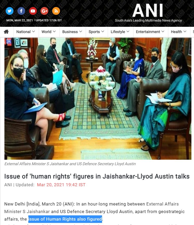 ಆದರೆ ಅದಕ್ಕೂ ಮೊದಲು ಇದೇ ಎಎನ್‌ಐ ‘ವಿಶ್ವಾಸಾರ್ಹ’ ಮೂಲಗಳನ್ನು ಉಲ್ಲೇಖಿಸಿ, “ವಿದೇಶಾಂಗ ವ್ಯವಹಾರಗಳ ಸಚಿವ ಜೈಶಂಕರ್ ಮತ್ತು ಯುಎಸ್ ರಕ್ಷಣಾ ಕಾರ್ಯದರ್ಶಿ ಲಾಯ್ಡ್ ಆಸ್ಟಿನ್ ನಡುವೆ ನಡೆದ ಒಂದು ಗಂಟೆಯ ಚರ್ಚೆಯಲ್ಲಿ ಮಾನವ ಹಕ್ಕುಗಳ ವಿಷಯವೂ ಸಹ ಕಾಣಿಸಿಕೊಂಡಿದೆ’ ಎಂದು ವರದಿ ಮಾಡಿದೆ.