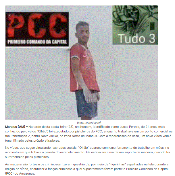 ನಾವು ಘಟನೆ ವಿಡಿಯೋ ಕುರಿತು ಇನ್ನಷ್ಟು ಮಾಹಿತಿ ಹುಡುಕಿದಾಗ 28 ಜೂನ್ 2024 ರಂದು ಪೋರ್ಚುಗೀಸ್ ಭಾಷೆಯ portaltucuma.com.br ಎಂಬ ವೆಬ್ಸೈಟ್ನಲ್ಲಿ ಪ್ರಕಟಗೊಂಡ ವರದಿಯೊಂದು ಪತ್ತೆಯಾಗಿದೆ. ಆ ವರದಿಯಲ್ಲಿ ಬ್ರೆಝಿಲ್ನ ಮನೌಸ್ ನಗರದ ನೊವೊ ಅಲೆಕ್ಸೊ ಎಂಬಲ್ಲಿನ ಮನೆಯೊಂದರಲ್ಲಿ ಪೇಂಟಿಂಗ್ ಕೆಲಸ ಮಾಡುತ್ತಿದ್ದ ಲ್ಯೂಕಾಸ್ ಪೆರೇರಾ ಎಂಬ ವ್ಯಕ್ತಿಯನ್ನು ಗುಂಡಿಕ್ಕಿ ಹತ್ಯೆ ಮಾಡಲಾಗಿದೆ ಎಂದು ವಿವರಿಸಲಾಗಿದೆ.