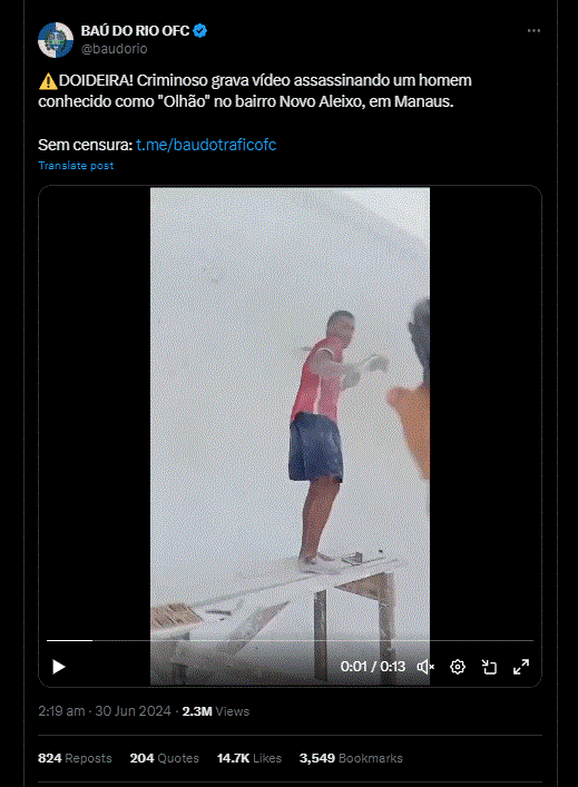 ಹುಚ್ಚ ಕ್ರಿಮಿನಲ್ ಓರ್ವ ಮನೌಸ್ನ ನೊವೊ ಅಲೆಕ್ಸೊದಲ್ಲಿ ಓಲ್ಹಾವೊ ಎಂಬ ವ್ಯಕ್ತಿಯನ್ನು ಕೊಲೆ ಮಾಡಿ ಅದನ್ನು ವಿಡಿಯೋ ರೆಕಾರ್ಡ್ ಮಾಡಿದ್ದಾನೆ ಎಂದು ಎಕ್ಸ್ ಪೋಸ್ಟ್ನಲ್ಲಿ ಬರೆದುಕೊಳ್ಳಲಾಗಿದೆ.
