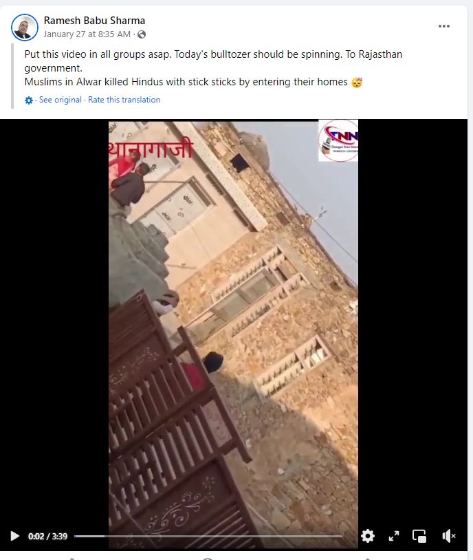 ರಾಜಸ್ಥಾನದ ಅಲ್ವಾರ್‌ನಲ್ಲಿ ಹಿಂದೂ-ಮುಸ್ಲಿಮರ ನಡುವೆ ಘರ್ಷಣೆ ನಡೆದಿದೆ ಎಂಬ ವಿಡಿಯೋವೊಂದು ಸಾಮಾಜಿಕ ಜಾಲತಾಣಗಳಲ್ಲಿ ಹರಿದಾಡುತ್ತಿದೆ.