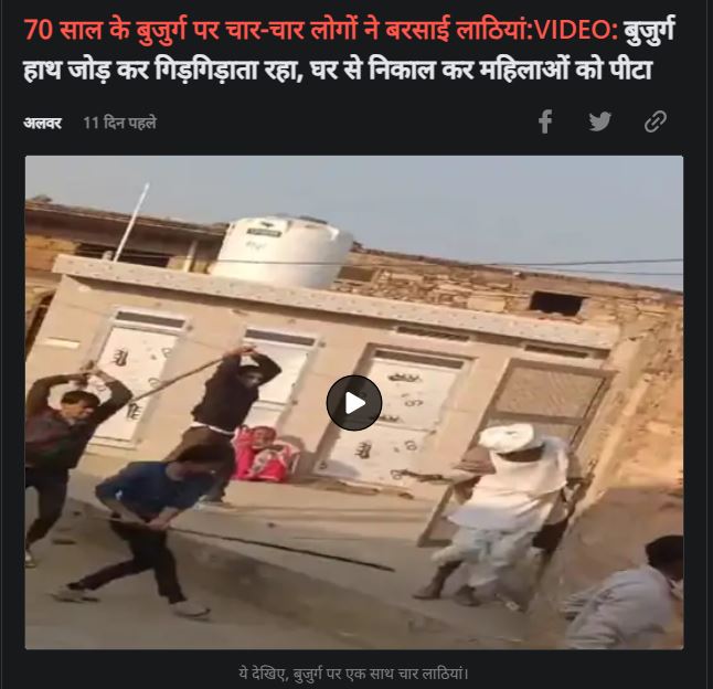 ಪುರುಷರ ತಂಡವೊಂದು ಮಹಿಳೆಯರು, ವೃದ್ದರು ಸೇರಿದಂತೆ ಕೆಲ ಜನರ ಮೇಲೆ ದೊಣ್ಣೆಯಿಂದ ಥಳಿಸುತ್ತಿರುವುದನ್ನು ವಿಡಿಯೋದಲ್ಲಿ ಕಾಣಬಹುದು. “ರಾಜಸ್ಥಾನದ ಅಲ್ವಾರ್‌ನಲ್ಲಿ ಮುಸ್ಲಿಮರು ಹಿಂದೂಗಳ ಮೇಲೆ ದಾಳಿ ಮಾಡಿದ್ದಾರೆ” ಎಂದು ಬರೆದು ವಿಡಿಯೋ ಹಂಚಲಾಗ್ತಿದೆ.