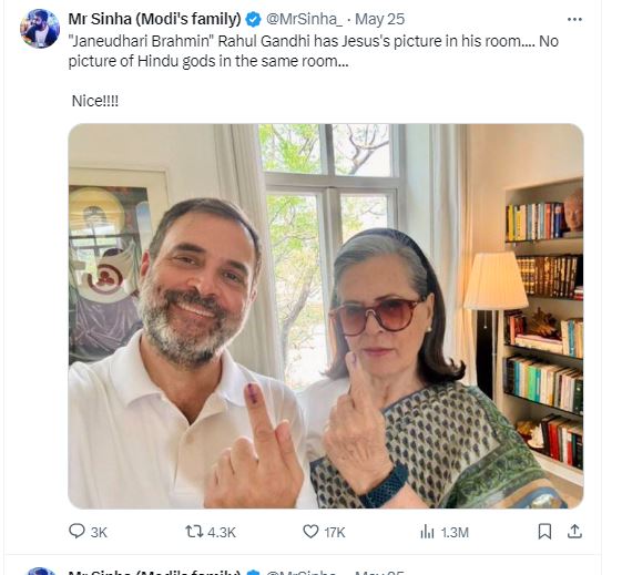 ಸದಾ ಸುಳ್ಳು ಪೋಸ್ಟ್‌ಗಳನ್ನು ಹಾಕುವಲ್ಲಿ ಪ್ರಸಿದ್ದಿ ಪಡೆದಿರುವ ಬಲಪಂಥೀಯ ಎಕ್ಸ್ ಬಳಕೆದಾರ MrSinha (mrsinha)ರಾಹುಲ್ ಗಾಂಧಿ ಮತ್ತು ಸೋನಿಯಾ ಗಾಂಧಿಯ ಸೆಲ್ಫಿ ಹಂಚಿಕೊಂಡು ” ಜನಿವಾರದಾರಿ ಬ್ರಾಹ್ಮಣ ರಾಹುಲ್ ಗಾಂಧಿಯ ಕೋಣೆಯಲ್ಲಿ ಏಸು ಕ್ರಿಸ್ತನ ಚಿತ್ರವಿದೆ. ಆದರೆ, ಯಾವುದೇ ಹಿಂದೂ ದೇವರುಗಳ ಚಿತ್ರಗಳಿಲ್ಲ” ಎಂದು ಬರೆದುಕೊಂಡಿದ್ದಾರೆ.