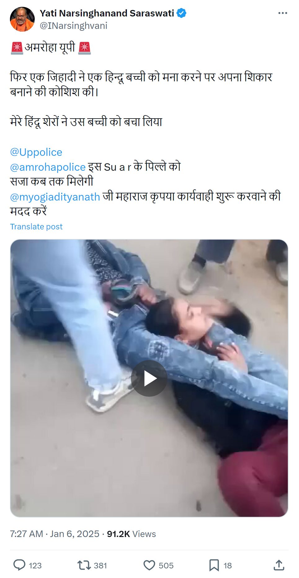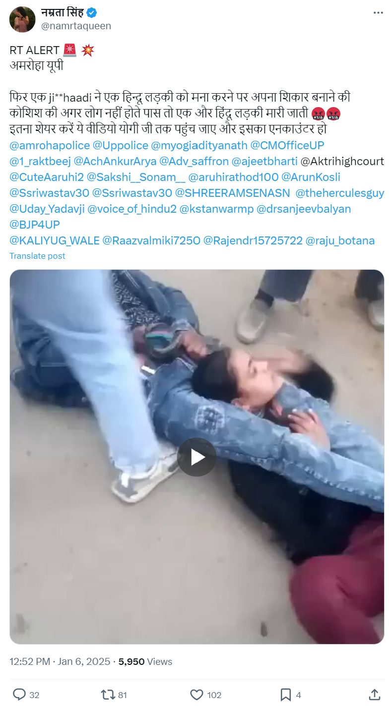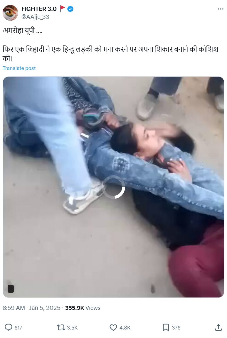 ಜನವರಿ 6ರಂದು ‘ಯತಿ ನರಸಿಂಗಾನಂದ ಸರಸ್ವತಿ’ ಎಂಬ ಎಕ್ಸ್ ಖಾತೆಯಲ್ಲಿ ವೈರಲ್ ವಿಡಿಯೋವನ್ನು ಹಂಚಿಕೊಳ್ಳಲಾಗಿದ್ದು, “ಈ ಘಟನೆ ಉತ್ತರ ಪ್ರದೇಶದ ಅಮ್ರೋಹದಲ್ಲಿ ನಡೆದಿದೆ. ಜಿಹಾದಿಯೊಬ್ಬ ಹಿಂದೂ ಯುವತಿ ಮೇಲೆ ದಾಳಿ ನಡೆಸಲು ಯತ್ನಿಸಿದ್ದ. ಈ ವೇಳೆ ರಕ್ಷಣೆಗೆ ಬಂದ ಹಿಂದೂ ಯುವಕರು, ಆತನ ಪ್ರಯತ್ನವನ್ನು ವಿಫಲಗೊಳಿಸಿದ್ದಾರೆ” ಎಂದು ಬರೆದುಕೊಂಡಿದ್ದರು.