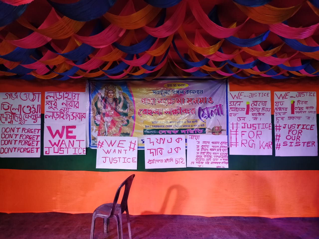 ಆದರೆ, ವೈರಲ್ ವಿಡಿಯೋದಲ್ಲಿರುವ ವೇದಿಕೆಯಲ್ಲಿ “ಜೈ ಮಾ ಮಾನಸ. ಗಂಗಾನದಿಯ ದಡದಲ್ಲಿ ಮಾ ಮಾನಸ ಮತ್ತು ಬೆಹುಲಾ-ಲಖಿಂದರ್ ಮೇಳ. ದಿನಾಂಕ : 31 ಶ್ರಾವಣದಿಂದ ಐದು ದಿನಗಳು. ಸ್ಥಳ: ಚಾರ್ ಬ್ರಹ್ಮನಗರ ಸೇವಕ ಸಮಿತಿ ಮೈದಾನ ಮತ್ತು ಗಂಗಾ ನದಿ ದಂಡೆ. ಸೇವಕ ಸಮಿತಿಯಿಂದ ಆಯೋಜಿಸಲಾಗಿದೆ” ಎಂದು ಬ್ಯಾನರ್‌ ಹಾಕಿರುವುದು ನೋಡಬಹುದು. ಆ ಬ್ಯಾನರ್‌ನಲ್ಲಿ ಹಿಂದೂ ದೇವಿಯ ಫೋಟೋ ಕೂಡ ಇದೆ.