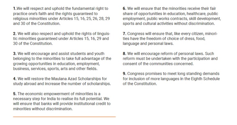 6. ಅಲ್ಪಸಂಖ್ಯಾತರು ಶಿಕ್ಷಣ, ಆರೋಗ್ಯ, ಸಾರ್ವಜನಿಕ ಉದ್ಯೋಗ, ಲೋಕೋಪಯೋಗಿ ಒಪ್ಪಂದಗಳು, ಕೌಶಲ್ಯ ಅಭಿವೃದ್ಧಿ, ಕ್ರೀಡೆ ಮತ್ತು ಸಾಂಸ್ಕೃತಿಕ ಚಟುವಟಿಕೆಗಳಲ್ಲಿ ತಾರತಮ್ಯವಿಲ್ಲದೆ ತಮ್ಮ ನ್ಯಾಯಯುತ ಪಾಲನ್ನು ಪಡೆಯುವುದನ್ನು ನಾವು ಖಚಿತಪಡಿಸುತ್ತೇವೆ.