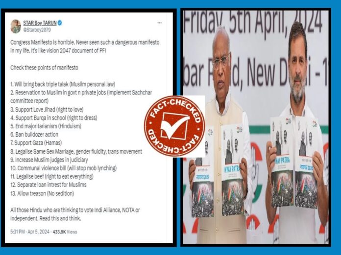 “ಕಾಂಗ್ರೆಸ್ ಪ್ರಣಾಳಿಕೆ ಭಯಾನಕವಾಗಿದೆ. ನನ್ನ ಜೀವನದಲ್ಲಿ ಇಂತಹ ಅಪಾಯಕಾರಿ ಪ್ರಣಾಳಿಕೆಯನ್ನು ನೋಡಿಲ್ಲ. ಇದು ಪಿಎಫ್ಐನ ವಿಷನ್-2047 ಡಾಕ್ಯುಮೆಂಟ್ ಇದ್ದಂತೆ. ತ್ರಿವಳಿ ತಲಾಖ್ ಅನ್ನು ಮರಳಿ ತರುತ್ತೇವೆ. ಸರ್ಕಾರಿ ಮತ್ತು ಖಾಸಗಿ ಉದ್ಯೋಗಗಳಲ್ಲಿ ಮುಸ್ಲಿಮರಿಗೆ ಮೀಸಲಾತಿ, ಲವ್ ಜಿಹಾದ್ ಮತ್ತು ಶಾಲೆಗಳಲ್ಲಿ ಬುರ್ಖಾಗೆ ಬೆಂಬಲ. ಬಹುಸಂಖ್ಯಾತವಾದವನ್ನು (ಹಿಂದೂ ಧರ್ಮ) ಕೊನೆಗೊಳಿಸುತ್ತೇವೆ. ಗೋಮಾಂಸವನ್ನು ಕಾನೂನು ಬದ್ದ ಮಾಡುತ್ತೇವೆ. ಮುಸ್ಲಿಮರಿಗೆ ಪ್ರತ್ಯೇಖ ಸಾಲ ಬಡ್ಡಿ ನೀಡುತ್ತೇವೆ ಎಂದು ಘೋಷಿಸಿಕೊಂಡಿದ್ದಾರೆ” ಎಂದು ಪ್ರತಿಪಾದಿಸಿ ಸಾಮಾಜಿಕ ಮಾಧ್ಯಮಗಳಲ್ಲಿ ಹಂಚಿಕೊಳ್ಳಲಾಗಿದೆ.