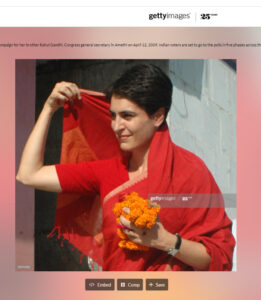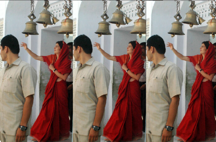 ಪ್ರಿಯಾಂಕಾ ಗಾಂಧಿ ವಾದ್ರಾ ಕೆಂಪು ಸೀರೆಯುಟ್ಟು, ದೇವಾಲಯದ ಗಂಟೆ ಬಾರಿಸುತ್ತಿರುವ ಫೋಟೋವನ್ನು ಸಾಮಾಜಿಕ ಮಾಧ್ಯಮದಲ್ಲಿ ವ್ಯಾಪಕವಾಗಿ ಹಂಚಿಕೊಳ್ಳಲಾಗುತ್ತಿದ್ದು, ಪ್ರಿಯಾಂಕಾ ಅವರು ಬಿಹಾರ ವಿಧಾನಸಭಾ ಚುನಾವಣೆಯ ಕಾರಣಕ್ಕೆ ಇಂದಿರಾಗಾಂಧಿಯವರ ಸೀರೆ ಧರಿಸಿದ್ದಾರೆ ಎಂದು ಈ ಪೋಸ್ಟ್ನಲ್ಲಿ ಪ್ರತಿಪಾದಿಸಲಾಗಿದೆ.