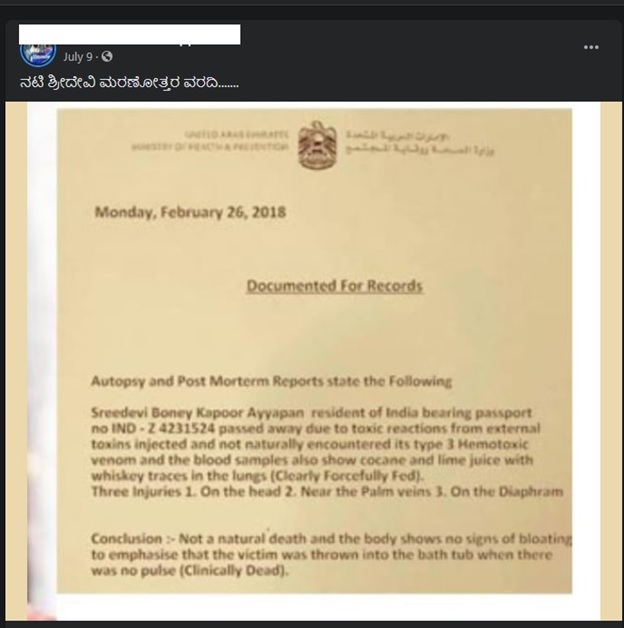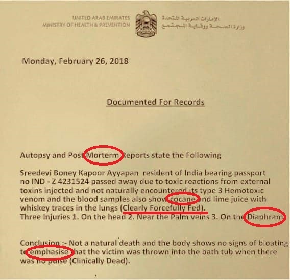 ನಟಿ ಶ್ರೀದೇವಿ ಅವರ ಮರಣೋತ್ತರ ವರದಿಯೆಂದು ಪ್ರತಿಪಾದಿಸಿ ವರದಿಯೊಂದರ ಚಿತ್ರವೊಂದು ಸಾಮಾಜಿಕ ಜಾಲತಾಣದಲ್ಲಿ ಹರಿದಾಡುತ್ತಿದೆ. ಆ ವರದಿಯಲ್ಲಿ ನಟಿ ಶ್ರೀದೇವಿಗೆ ಬಲವಂತವಾಗಿ ಕೊಕೇನ್ ನೀಡಲಾಗಿತ್ತು, ಅವರ ದೇಹದಲ್ಲಿ ಮೂರು ಗಾಯಗಳಿತ್ತು ಜೊತೆಗೆ ಅವರ ಸಾವು ಸಹಜವಲ್ಲ ಎಂದು ಹೇಳುತ್ತದೆ. ಸಾಮಾಜಿಕ ಜಾಲತಾಣದಲ್ಲಿ ಹರಿದಾಡುತ್ತಿರುವ ಆ ಚಿತ್ರದ ಸತ್ಯಾಂಶವನ್ನು ಪರಿಶೀಲಿಸೋಣ.