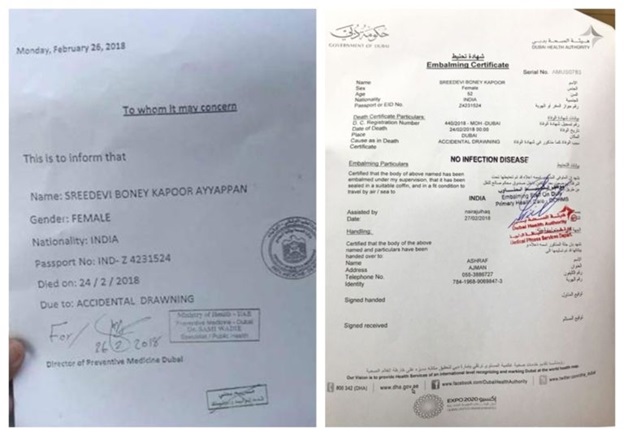 ‘‘Sridevi death UAE’ ಎಂಬ ಕೀವರ್ಡ್ ಮೂಲಕ ಗೂಗಲ್ನಲ್ಲಿ ಹುಡುಕಾಟ ನಡೆಸಿದರೆ ದುಬೈ ಮೀಡಿಯಾ ಆಫಿಸ್ ಎಂಬ ಅಧೀಕೃತ ಟ್ವೀಟ್ಟರ್ನಲ್ಲಿ ಇದರ ಮಾಹಿತಿಯನ್ನು ಪಡೆಯಬಹುದಾಗಿದೆ. ಇದರಲ್ಲಿ ನಟಿಯು ಪ್ರಜ್ಞೆ ತಪ್ಪಿ, ನಂತರ ಸ್ನಾನದತೊಟ್ಟಿಯಲ್ಲಿ ಮುಳುಗಿ ಸಾವಿಗೀಡಾಗಿದ್ದಾರೆ ಎಂದು ಹೇಳಿದೆ. ಈ ವರದಿಯಲ್ಲಿ ಯಾವುದೇ ಗಾಯಗಳ ಬಗ್ಗೆ ಉಲ್ಲೇಖವಿಲ್ಲ.