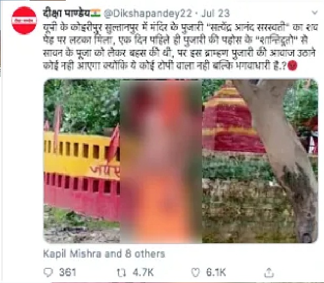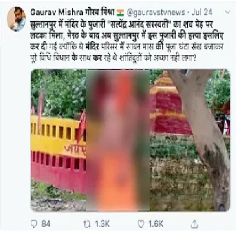 ಮುಸಲ್ಮಾನರೊಂದಿಗೆ ವಾಗ್ವದ ಮಾಡಿದ್ದಕ್ಕಾಗಿ ಉತ್ತರ ಪ್ರದೇಶದ ಸುಲ್ತಾನಪುರದ ಅರ್ಚಕನನ್ನು ಕೊಲ್ಲಲಾಗಿದೆ ಎಂಬ ಸಂದೇಶದೊಂದಿಗೆ ಮರಕ್ಕೆ ನೇಣು ಹಾಕಿದ್ದ ವ್ಯಕ್ತಿಯ ಮೃತ ದೇಹದ ಚಿತ್ರವು ಸಾಮಾಜಿಕ ಜಾಲತಾಣದಲ್ಲಿ ವೈರಲ್ ಆಗುತ್ತಿದೆ.