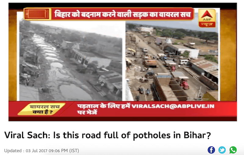 ಇದೇ ಚಿತ್ರವು 2017ರಲ್ಲಿ ವೈರಲ್ ಆದಾಗ ಆಗಿನ ಬಿಹಾರದ ರಸ್ತೆ ಸಾರಿಗೆ ಸಚಿವ ತೇಜಸ್ವಿ ಯಾದವ್ ಈ ಚಿತ್ರದೊಂದಿಗೆ ಮತ್ತೊಂದು ಚಿತ್ರವನ್ನು ಟ್ವೀಟ್ ಮಾಡಿ ಆರೋಪಗಳು ವಾಸ್ತವಕ್ಕೆ ದೂರವಾಗಿದೆ ಎಂದು ಸ್ಪಷ್ಟಪಡಿಸಿದ್ದರು. ಎಬಿಪಿ ಲೈವ್ ಸುದ್ದಿ ವಾಹಿನಿಯೂ ಈ ಕುರಿತು ತನಿಖಾ ವರದಿಯೊದನ್ನು ಪ್ರಕಟಿಸಿ ಇದು ಭಾಗಲ್ಪುರ್ ರಾಷ್ಟ್ರೀಯ ಹೆದ್ದಾರಿ ಎಂದು ಖಚಿತಪಡಿಸಿತ್ತು. ಈ ಚಿತ್ರ ವೈರಲ್ ಆಗುವ ವೇಳೆಗಾಗಲೇ ಹೊಸ ರಸ್ತೆ ನಿರ್ಮಾಣವಾಗಿತ್ತು ಎಂದು ಅದು ತನ್ನ ವರದಿಯಲ್ಲಿ ತಿಳಿಸಿತ್ತು.