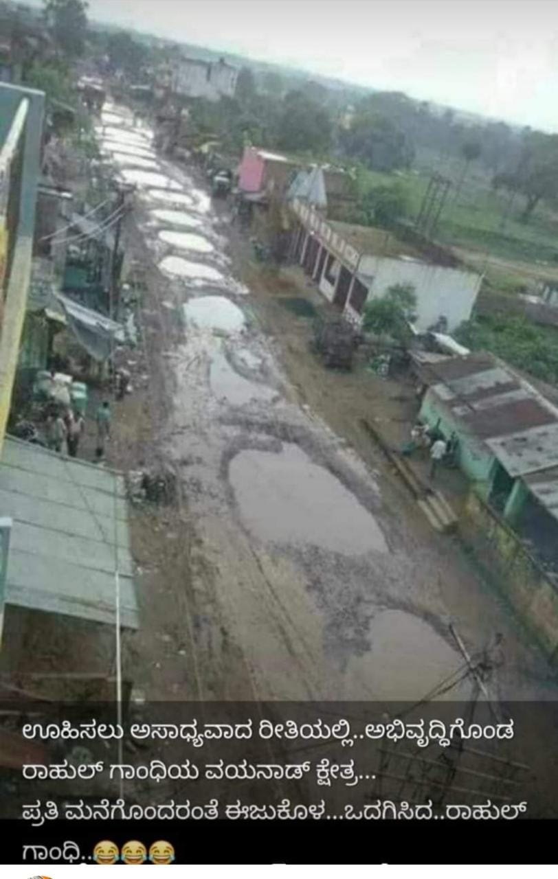 ರಸ್ತೆ ತುಂಬಾ ಗುಂಡಿಗಳೇ ತುಂಬಿಕೊಂಡಿರುವ ಫೋಟೊವೊಂದನ್ನು ರಾಹುಲ್ ಗಾಂಧಿಯವರ ಲೋಕಸಭಾ ಕ್ಷೇತ್ರ ವಯನಾಡ್ ಎಂಬ ಪ್ರತಿಪಾದನೆಯೊಂದಿಗೆ ಸಾಮಾಜಿಕ ಜಾಲತಾಣದಲ್ಲಿ ವ್ಯಾಪಕವಾಗಿ ಹಂಚಿಕೊಳ್ಳಲಾಗುತ್ತಿದೆ. ಈ ಚಿತ್ರವನ್ನು ಪ್ರತಿ ವರ್ಷ ಬೇರೆ ಬೇರೆ ಸ್ಥಳಗಳೆಂದು ಸೋಷಿಯಲ್ ಮೀಡಿಯಾದಲ್ಲಿ ವೈರಲ್ ಮಾಡಲಾಗುತ್ತದೆ. ಹಾಗಾದರೆ ವಾಸ್ತವವೇನು ಎಂಬುದನ್ನು ಪರಿಶೀಲಿಸೋಣ.