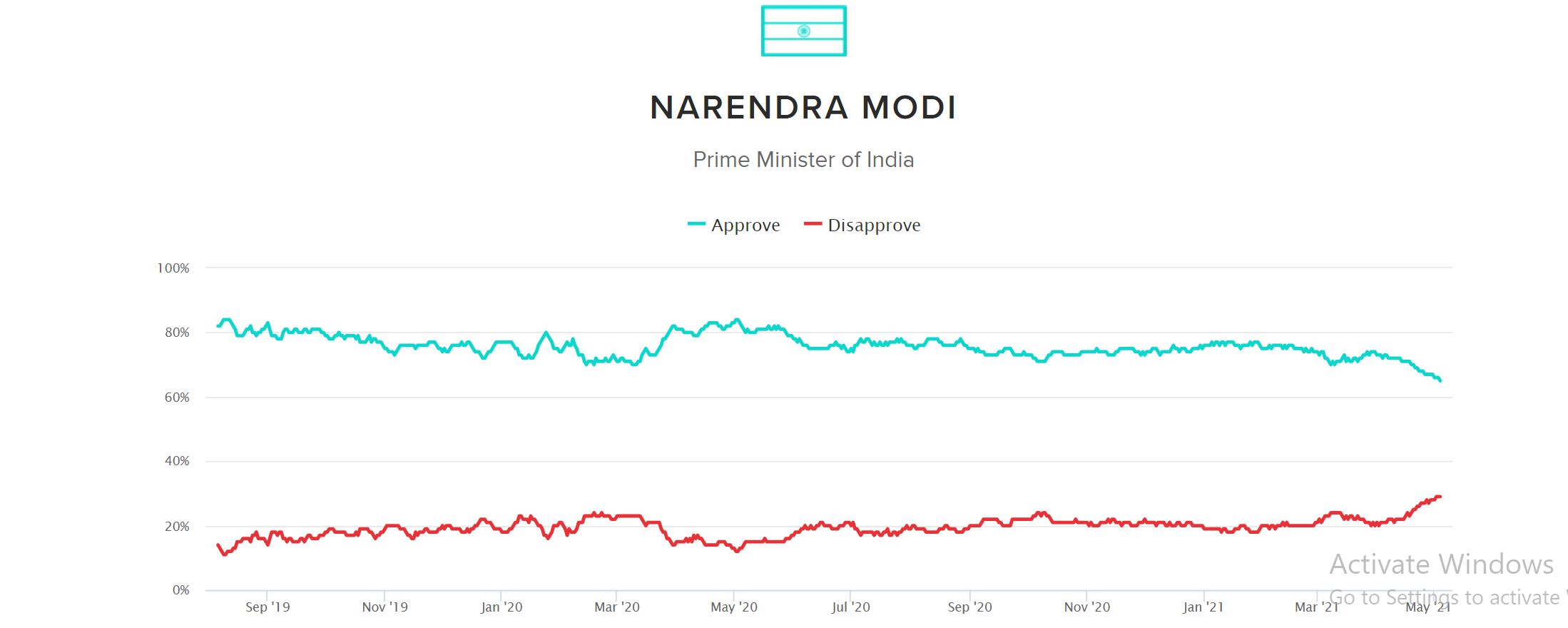 ಉಳಿದ ವಿಶ್ವ ನಾಯಕರಿಗೆ ಹೋಲಿಸಿದರೆ ನರೇಂದ್ರ ಮೋದಿಯವರ ಜನಪ್ರಿಯತೆ ಈಗಲೂ ಹೆಚ್ಚಿಗೆಯೇ ಇದೆ. ಆದರೆ ಸಾಂಕ್ರಾಮಿಕ ರೋಗವನ್ನು ತಡೆಗಟ್ಟಲು ಅವರು ಅನುಸರಿಸಿದ ಕ್ರಮಗಳಿಂದ ತೀವ್ರ ಟೀಕೆಗೆ ಒಳಗಾದ ಅವರ ಜನಪ್ರಿಯತೆ ದೊಡ್ಡ ಮಟ್ಟದಲ್ಲಿ ಕುಸಿಯಲು ಆರಂಭಿಸಿದೆ.