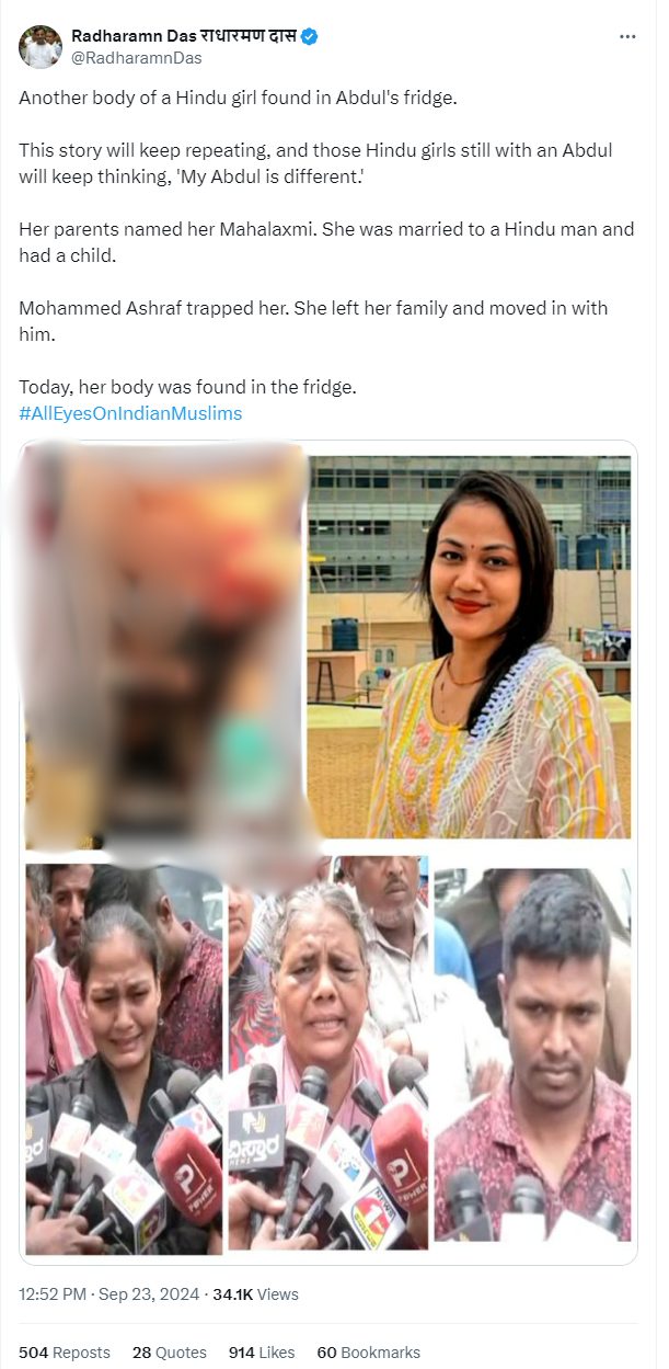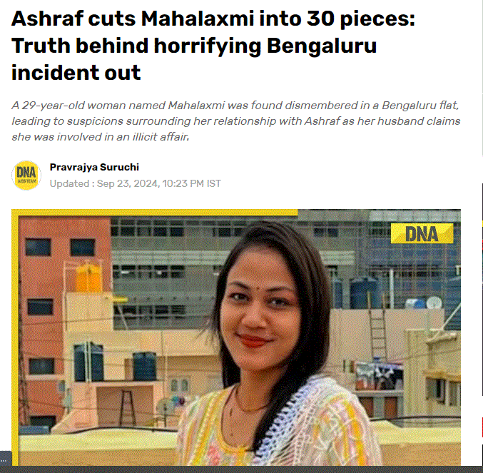 ಸೆಪ್ಟೆಂಬರ್ 23, 2024ರಂದು ಎಕ್ಸ್ನಲ್ಲಿ ಇಂಡಿಯಾ ಟುಡೇ ಸುದ್ದಿಯನ್ನು ಪೋಸ್ಟ್ ಮಾಡಿದ್ದ ಕೋಮು ದ್ವೇಷದ ಸುದ್ದಿಗಳನ್ನು ಹರಡುವ ಬಲಪಂಥೀಯ ಸಾಮಾಜಿಕ ಜಾಲತಾಣ ಪ್ರಭಾವಿ ಮಿ.ಸಿನ್ಹಾ ” ಬೆಂಗಳೂರು ಕೊಲೆ ಪ್ರಕರಣದಲ್ಲಿ ಆಘಾತಕಾರಿ ಅಂಶ ಬಹಿರಂಗ: ಮಹಿಳೆಯ ಶವ 32 ತುಂಡಾಗಿ ಕತ್ತರಿಸಿ ಫ್ರಿಡ್ಜ್ನಲ್ಲಿ ಶೇಖರಿಸಿಟ್ಟ ಸ್ಥಿತಿಯಲ್ಲಿ ಪತ್ತೆಯಾಗಿದೆ. ಇಂಡಿಯಾ ಟುಡೇ ವರದಿ ಪ್ರಕಾರ ಸಂತ್ರಸ್ತೆಯನ್ನು ಮಹಾಲಕ್ಷ್ಮಿ ಎಂದು ಗುರುತಿಸಲಾಗಿದೆ. ಅಶ್ರಫ್ ಎಂಬ ವ್ಯಕ್ತಿಯೊಂದಿಗೆ ವಿವಾಹೇತರ ಸಂಬಂಧ ಹೊಂದಿದ್ದಳು ಎಂದು ಆಕೆಯ ಪತಿ ಆರೋಪಿಸಿದ್ದಾರೆ” ಎಂದು ಬರೆದುಕೊಂಡಿದ್ದರು.