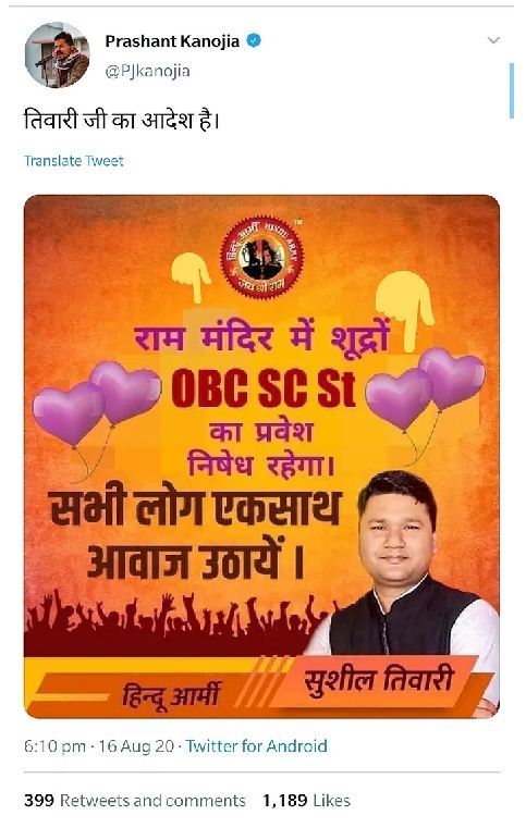 ಕನೋಜಿಯಾ ಟ್ವೀಟ್ ಮಾಡಿದ ಫೋಟೋದಲ್ಲಿ, ಚಿತ್ರ ಮತ್ತು ಹಿನ್ನೆಲೆ ಒಂದೇ ರೀತಿ ಕಾಣುತ್ತದೆ. ಆದರೆ, “ತಿವಾರಿ ಆದೇಶದ ಪ್ರಕಾರ, ರಾಮ ಮಂದಿರದೊಳಗೆ ಯಾವುದೇ ಶೂದ್ರ, ಎಸ್ಸಿ, ಎಸ್ಟಿ ಅಥವಾ ಒಬಿಸಿಗಳಿಗೆ ಪ್ರವೇಶವಿಲ್ಲ” ಎಂಬ ಶೀರ್ಷಿಕೆಯೊಂದಿಗೆ ಕನೋಜಿಯಾ ಟ್ವೀಟ್ ಮಾಡಿದ್ದಾರೆ.