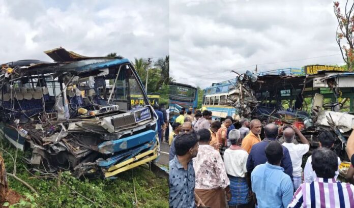 ತಮಿಳುನಾಡಿನಲ್ಲಿ ಭೀಕರ ರಸ್ತೆ ಅಪಘಾತ ಸಂಭವಿಸಿದ್ದು, ಎರಡು ಖಾಸಗಿ ಬಸ್ ಗಳು ಮುಖಾಮುಖಿ ಢಿಕ್ಕಿಯಾಗಿ ಕನಿಷ್ಠ 6 ಮಂದಿ ಸಾವನ್ನಪ್ಪಿದ್ದು, 39 ಮಂದಿ ಗಾಯಗೊಂಡಿದ್ದಾರೆ.