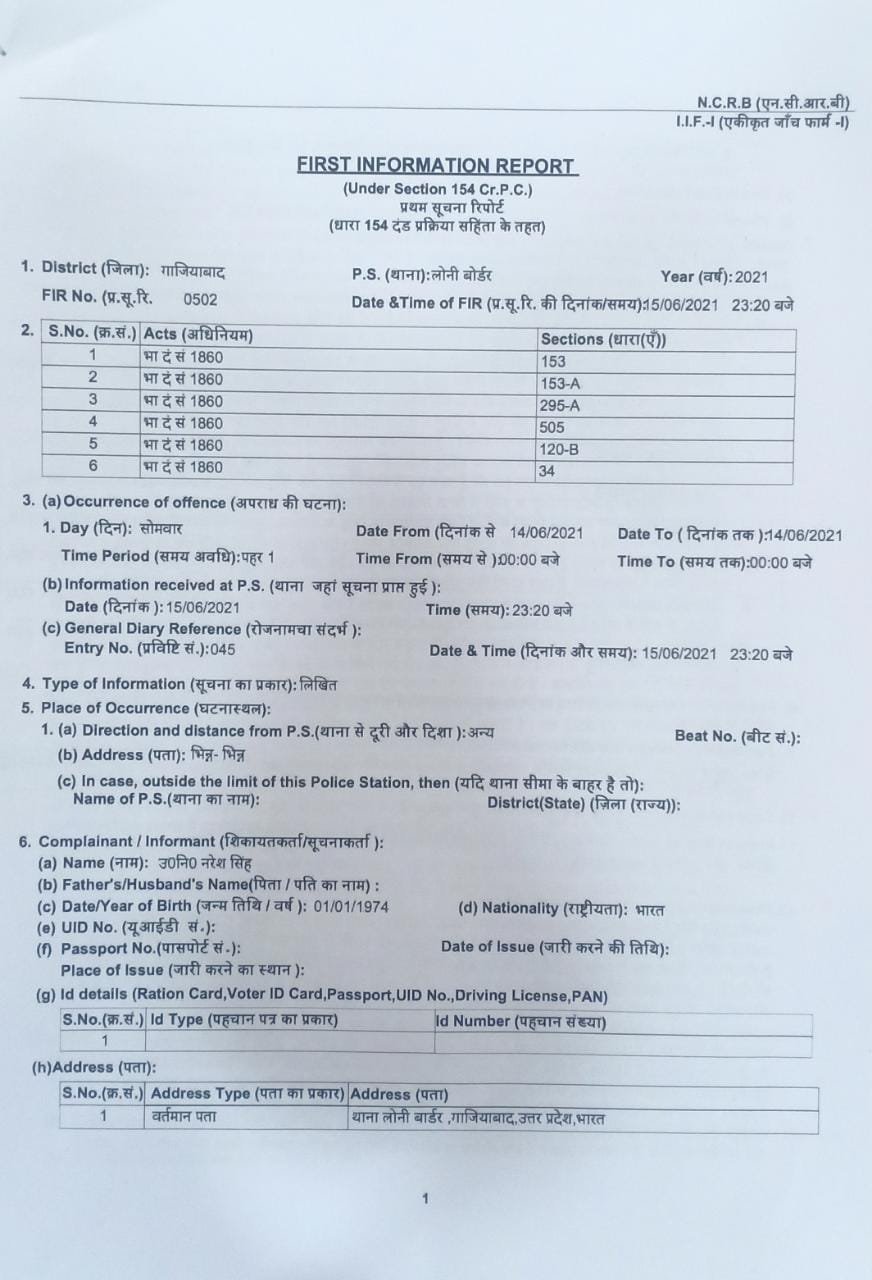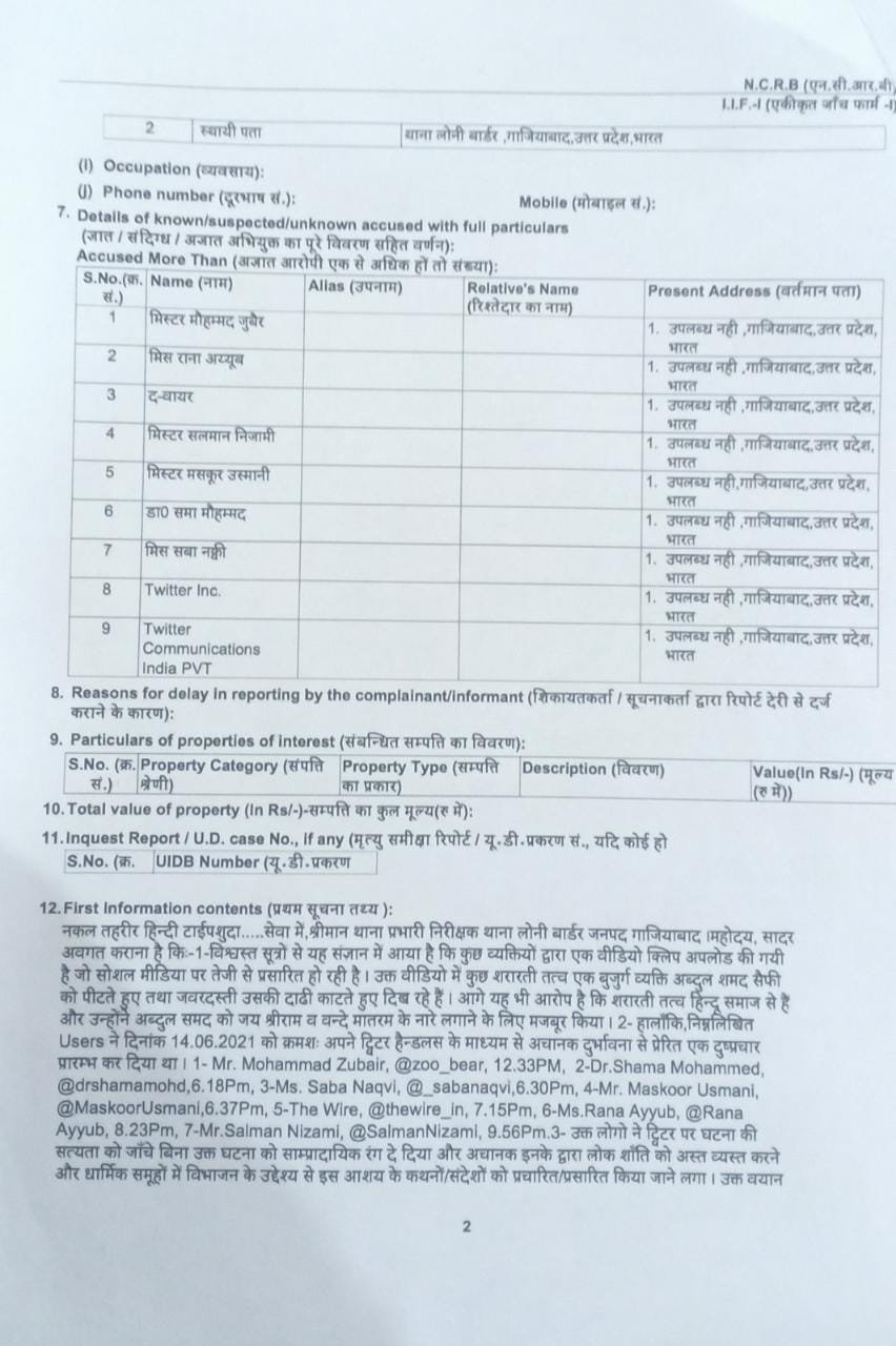 ಗಾಜಿಯಾಬಾದ್ ಪೊಲೀಸರು ಪತ್ರಕರ್ತರಾದ ಮೊಹಮ್ಮದ್ ಜುಬೈರ್, ರಾಣಾ ಆಯೂಬ್, ಸಬಾ ನಖ್ವಿ, ಡಿಜಿಟಲ್ ಮಾಧ್ಯಮ ಸಂಸ್ಥೆಯಾದ ದಿ ವೈರ್, ಕಾಂಗ್ರೆಸ್ ನಾಯಕರಾದ ಸಲ್ಮಾನ್ ನಿಜಾಮಿ, ಮಸ್ಕೂರ್ ಉಸ್ಮಾನಿ, ಶಮಾ ಮೊಹಮ್ಮದ್ ಮತ್ತು ಟ್ವಿಟರ್ ಇಂಕ್ ಮತ್ತು ಟ್ವಿಟರ್ ಇಂಡಿಯಾ ವಿರುದ್ಧ ಎಫ್ಐಆರ್ ದಾಖಲಿಸಿದ್ದಾರೆ.