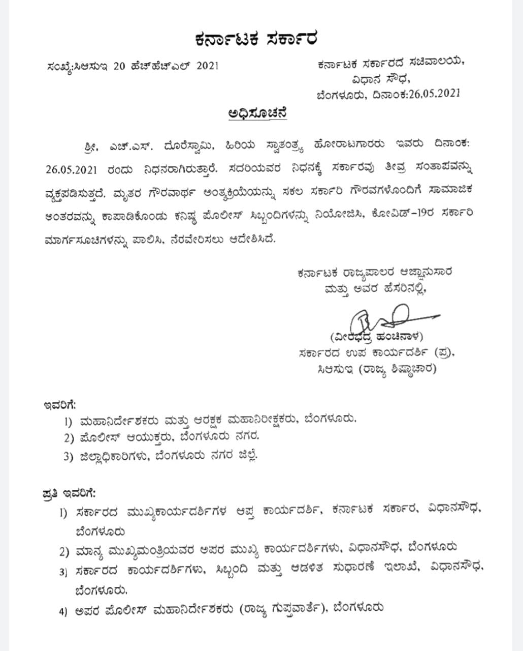 “ದೊರೆಸ್ವಾಮಿಯವರ ನಿಧನಕ್ಕೆ ಸರ್ಕಾರವು ತೀವ್ರ ಸಂತಾಪ ವ್ಯಕ್ತಪಡಿಸುತ್ತದೆ. ಮೃತರ ಗೌರವಾರ್ಥ ಅಂತ್ಯಕ್ರಿಯೆಯನ್ನು ಸಕಲ ಸರ್ಕಾರಿ ಗೌರವಗಳೊಂದಿಗೆ ಸಾಮಾಜಿಕ ಅಂತರವನ್ನು ಕಾಯ್ದುಕೊಂಡು ಕನಿಷ್ಠ ಪೊಲೀಸ್ ಸಿಬ್ಬಂದಿಗಳನ್ನು ನಿಯೋಜಿಸಿ, ಕೋವಿಡ್ -19ರ ಸರ್ಕಾರಿ ಮಾರ್ಗಸೂಚಿಗಳನ್ನು ಪಾಲಿಸಿ ನೆರವೇರಿಸಲು ಆದೇಶಿಸಿದೆ” ಎಂದು ಸರ್ಕಾರದ ಉಪ ಕಾರ್ಯದರ್ಶಿ ವೀರಭದ್ರ ಹಂಚಿನಾಳರವರು ಆದೇಶ ಹೊರಡಿಸಿದ್ದಾರೆ.