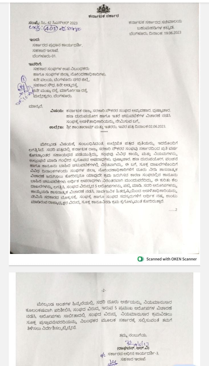 ಕರ್ನಾಟಕ ರಾಜ್ಯ ಸರಕಾರಿ ನೌಕರರ ಸಂಘದ ಅವ್ಯವಹಾರ, ಭ್ರಷ್ಟಾಚಾರ, ಹಣ ದುರುಪಯೋಗ ಹಾಗೂ ಇತರ ಚಟುವಟಿಕೆಗಳ ವಿಚಾರಣೆ ನಡೆಸಿ ಸಂಘಕ್ಕೆ ಆಡಳಿತಾಧಿಕಾರಿಯನ್ನು ನೇಮಿಸಬೇಕೆಂದು ಸಹಕಾರ ಇಲಾಖೆಯ ಕಾರ್ಯದರ್ಶಿಗಳು ಆದೇಶ ಹೊರಡಿಸಿದ್ದಾರೆ.