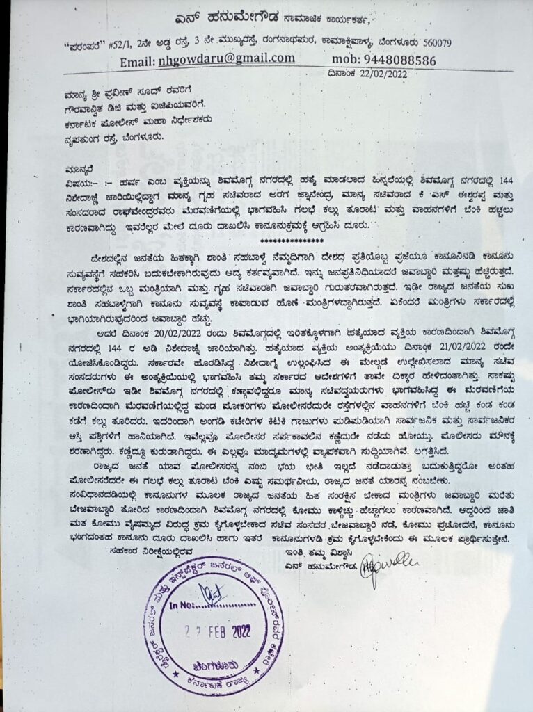 ಹರ್ಷ ಕೊಲೆ ಹಿನ್ನೆಲೆಯಲ್ಲಿ ಶಿವಮೊಗ್ಗ ನಗರದಲ್ಲಿ 144 ನಿಷೇದಾಜ್ಞೆ ಜಾರಿಯಲ್ಲಿದ್ದಾಗ ನಡೆದ ಮೆರವಣಿಗೆ ವೇಳೆ ಸಚಿವರಾದ ಕೆ.ಎಸ್.ಈಶ್ವರಪ್ಪ ಮತ್ತು ಸಂಸದರಾದ ರಾಘವೇಂದ್ರ ಅವರು ಭಾಗವಹಿಸಿದ್ದಾರೆ. ಇದು ಗಲಭೆ, ಕಲ್ಲು ತೂರಾಟ ಮತ್ತು ವಾಹನಗಳಿಗೆ ಬೆಂಕಿ ಹಚ್ಚಲು ಕಾರಣವಾಗಿದ್ದು, ಇವರ ಮೇಲೆ ದೂರು ದಾಖಲಿಸಿ ಕಾನೂನುಕ್ರಮ ಕೈಗೊಳ್ಳಬೇಕು ಎಂದು ಆಗ್ರಹಿಸಿದ್ದಾರೆ.