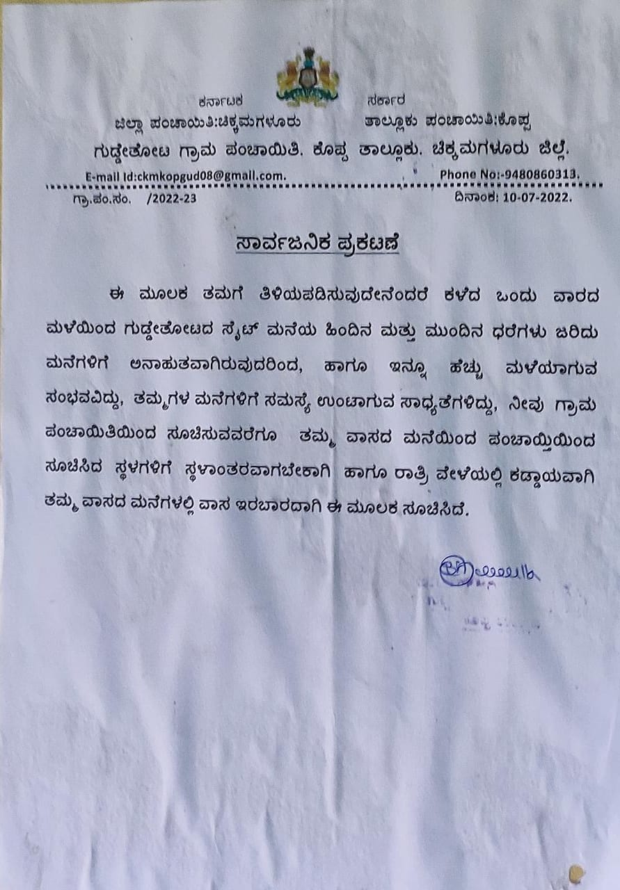 “ಈ ಮೂಲಕ ತಮಗೆ ತಿಳಿಯಪಡಿಸುವುದೇನೆಂದರೆ ಕಳೆದ ಒಂದು ವಾರದ ಮಳೆಯಿಂದ ಗುಡ್ಡೇತೋಟದ ಸೈಟ್ ಮನೆಯ ಹಿಂದಿನ ಮತ್ತು ಮುಂದಿನ ಧರೆಗಳು ಜರಿದು ಮನೆಗಳಿಗೆ ಅನಾಹುತವಾಗಿರುವುದರಿಂದ, ಹಾಗೂ ಇನ್ನೂ ಹೆಚ್ಚು ಮಳೆಯಾಗುವ ಸಂಭವವಿದ್ದು, ತಮ್ಮಗಳ ಮನೆಗಳಿಗೆ ಸಮಸ್ಯೆ ಉಂಟಾಗುವ ಸಾಧ್ಯತೆಗಳಿದ್ದು, ನೀವು ಗ್ರಾಮ ಪಂಚಾಯಿತಿಯಿಂದ ಸೂಚಿಸುವವರೆಗೂ ತಮ್ಮ ವಾಸದ ಮನೆಯಿಂದ ಪಂಚಾಯ್ತಿಯಿಂದ ಸೂಚಿಸಿದ ಸ್ಥಳಗಳಿಗೆ ಸ್ಥಳಾಂತರವಾಗಬೇಕಾಗಿ ಹಾಗೂ ರಾತ್ರಿ ವೇಳೆಯಲ್ಲಿ ಕಡ್ಡಾಯವಾಗಿ ತಮ್ಮ ವಾಸದ ಮನೆಗಳಲ್ಲಿ ವಾಸ ಇರಬಾರದಾಗಿ ಈ ಮೂಲಕ ಸೂಚಿಸಿದೆ”